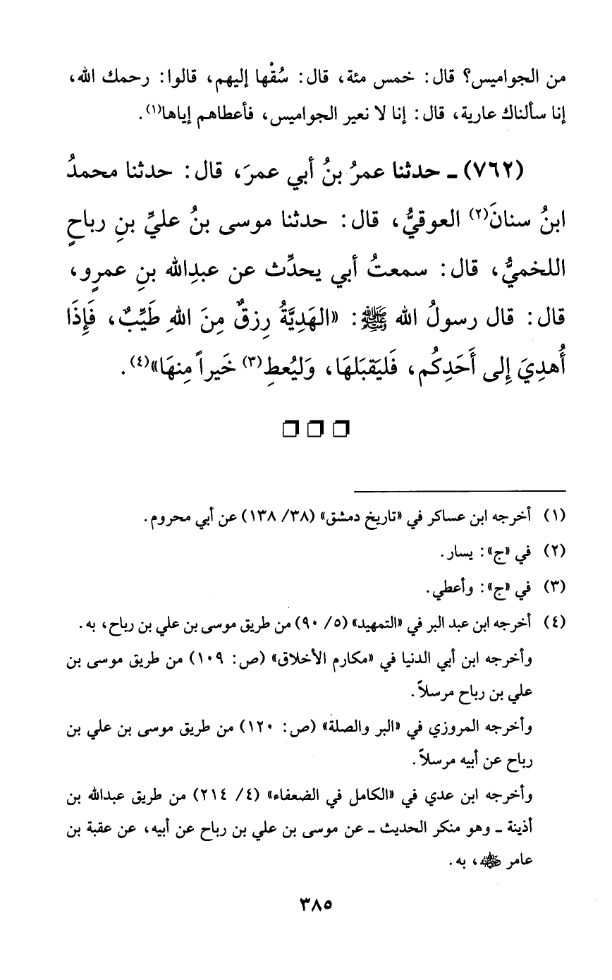 762 - حدثنا عمر بن أبي عمر، قال: حدثنا محمد ابن سنان العوقي، قال: حدثنا موسى بن علي بن رباحٍ اللخمي، قال: سمعت أبي يحدث عن عبد الله بن عمرٍو، قال: قال رسول الله صلى الله عليه وسلم: ((الهدية رزقٌ من الله طيبٌ، فإذا أهدي إلى أحدكم، فليقبلها، وليعط خيراً منها)).