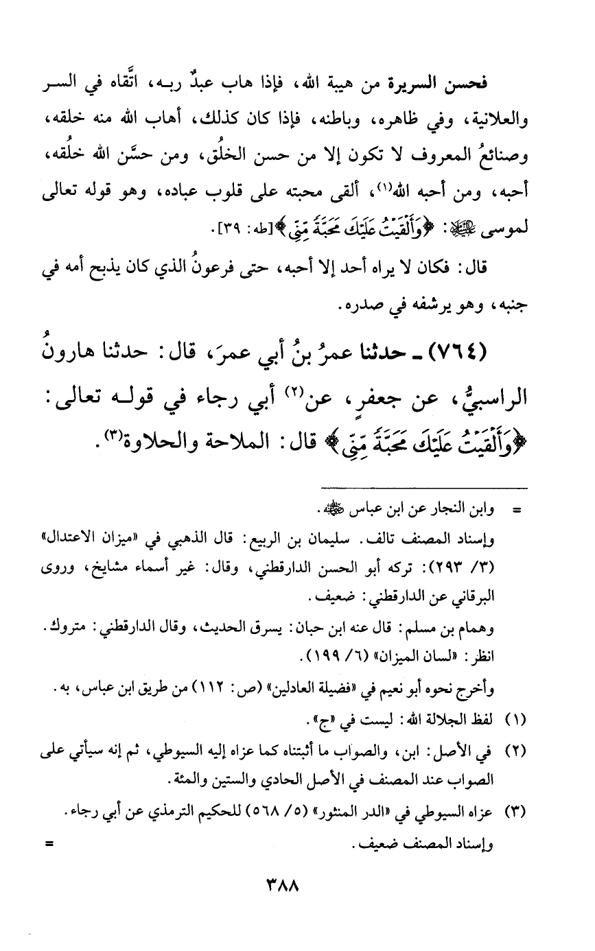 764 - حدثنا عمر بن أبي عمر، قال: حدثنا هارون الراسبي، عن جعفرٍ، عن أبي رجاء في قوله تعالى: {وألقيت عليك محبةً مني} قال: الملاحة والحلاوة.