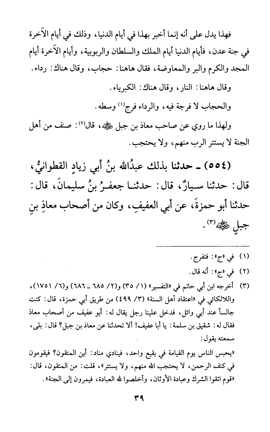 554 - حدثنا بذلك عبد الله بن أبي زياد القطواني، قال: حدثنا سيارٌ، قال: حدثنا جعفر بن سليمان، قال: حدثنا أبو حمزة، عن أبي العفيف، وكان من أصحاب معاذ بن جبلٍ رضي الله عنه.