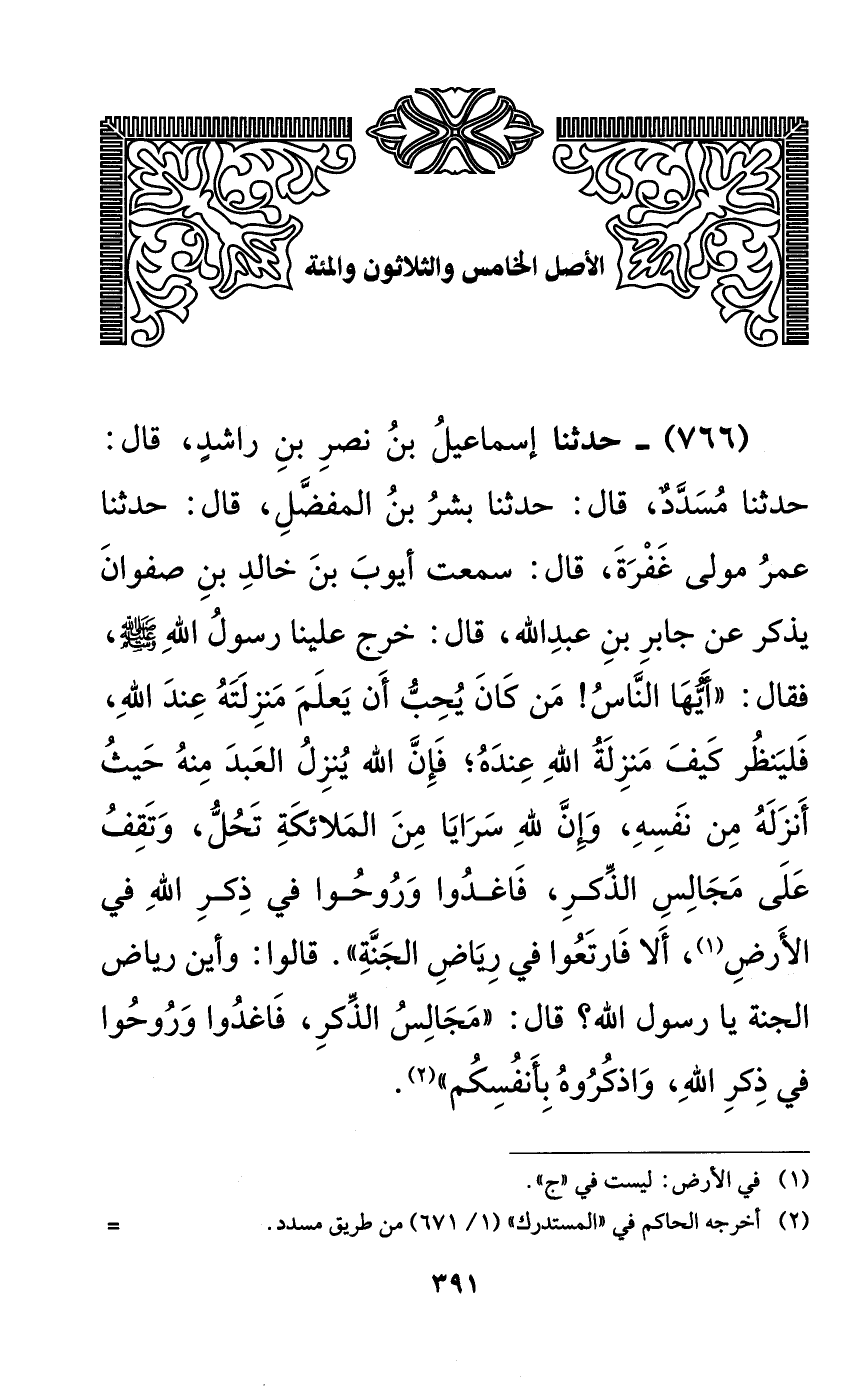 766 - حدثنا إسماعيل بن نصر بن راشدٍ، قال: حدثنا مسددٌ، قال: حدثنا بشر بن المفضل، قال: حدثنا عمر مولى غفرة، قال: سمعت أيوب بن خالد بن صفوان يذكر عن جابر بن عبد الله، قال: خرج علينا رسول الله صلى الله عليه وسلم، فقال: ((أيها الناس! من كان يحب أن يعلم منزلته عند الله، فلينظر كيف منزلة الله عنده؛ فإن الله ينزل العبد منه حيث أنزله من نفسه، وإن لله سرايا من الملائكة تحل، وتقف على مجالس الذكر، فاغدوا وروحوا في ذكر الله في الأرض، ألا فارتعوا في رياض الجنة)). قالوا: وأين رياض الجنة يا رسول الله؟ قال: ((مجالس الذكر، فاغدوا وروحوا في ذكر الله، واذكروه بأنفسكم)).