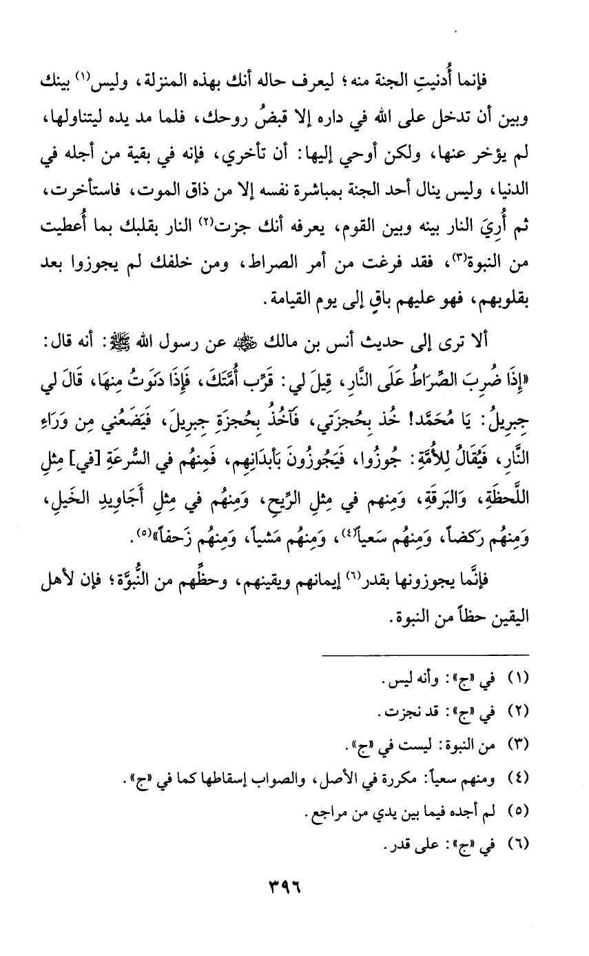 ألا ترى إلى حديث أنس بن مالك رضي الله عنه رسول الله صلى الله عليه وسلم: أنه قال: ((إذا ضرب الصراط على النار، قيل لي: قرب أمتك، فإذا دنوت منها، قال لي جبريل: يا محمد! خذ بحجزتي، فأخذ بحجزة جبريل، فيضعني من وراء النار، فيقال للأمة: جوزوا، فيجوزون بأبدانهم، فمنهم في السرعة [في] مثل اللحظة، والبرقة، ومنهم في مثل الريح، ومنهم في مثل أجاويد الخيل، ومنهم ركضاً، ومنهم سعياً، ومنهم مشياً، ومنهم زحفاً)).