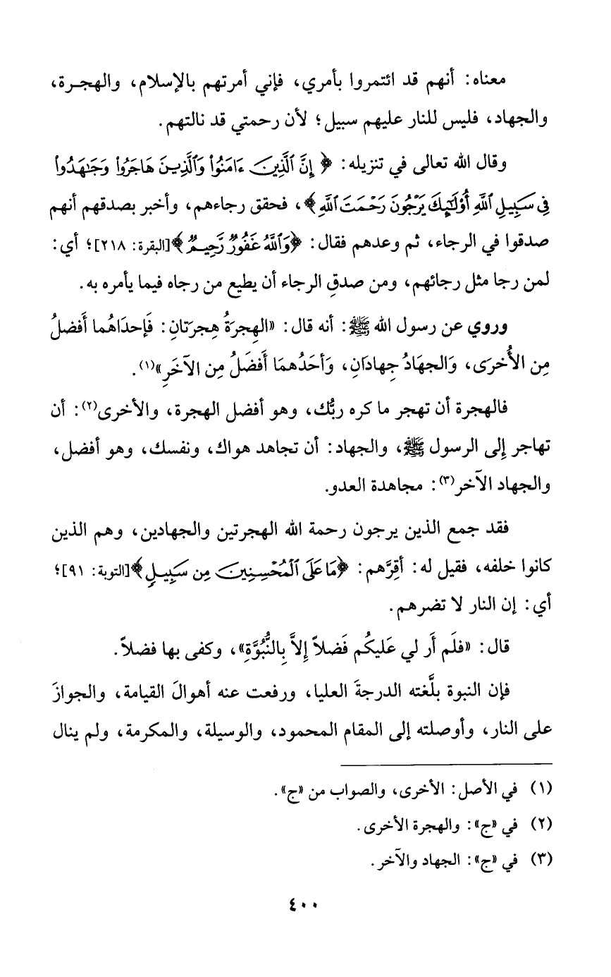 وروي عن رسول الله صلى الله عليه وسلم: أنه قال: ((الهجرة هجرتان: فإحداهما أفضل من الأخرى، والجهاد جهادان، وأحدهما أفضل من الآخر)).
