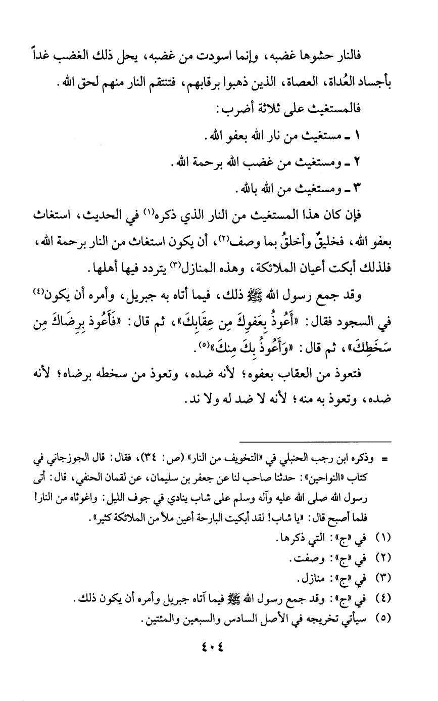 وقد جمع رسول الله صلى الله عليه وسلم ذلك، فيما أتاه به جبريل، وأمره أن يكون في السجود فقال: ((أعوذ بعفوك من عقابك))، ثم قال: ((فأعوذ برضاك من سخطك))، ثم قال: ((وأعوذ بك منك)).