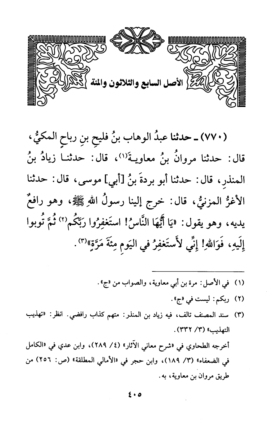 770 - حدثنا عبد الوهاب بن فليح بن رباحٍ المكي، قال: حدثنا مروان بن معاوية، قال: حدثنا زياد بن المنذر، قال: حدثنا أبو بردة بن [أبي] موسى، قال: حدثنا الأغر المزني، قال: خرج إلينا رسول الله صلى الله عليه وسلم، وهو رافعٌ يديه، وهو يقول: ((يا أيها الناس! استغفروا ربكم ثم توبوا إليه، فوالله! إني لأستغفر في اليوم مئة مرةٍ)).