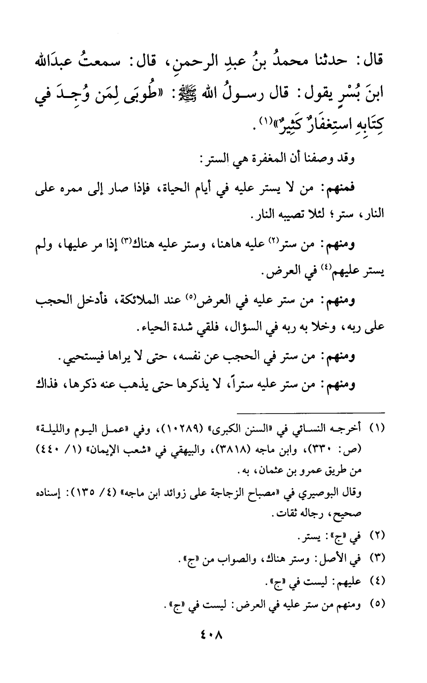 قال: حدثنا محمد بن عبد الرحمن، قال: سمعت عبد الله ابن بسرٍ يقول: قال رسول الله صلى الله عليه وسلم: ((طوبى لمن وجد في كتابه استغفارٌ كثيرٌ)).