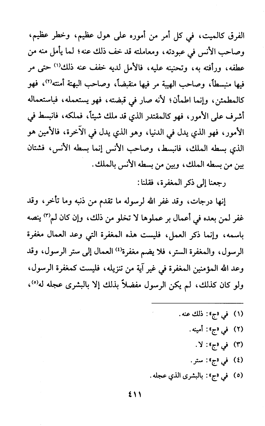 إنها درجات، وقد غفر الله لرسوله ما تقدم من ذنبه وما تأخر، وقد غفر لمن بعده في أعمال بر عملوها لا تخلو من ذلك، وإن كان لم ينصه باسمه، وإنما ذكر العمل، فليست هذه المغفرة التي وعد العمال مغفرة الرسول، والمغفرة الستر، فلا يضم مغفرة العمال إلى ستر الرسول، وقد وعد الله المؤمنين المغفرة في غير آية من تنزيله، فليست كمغفرة الرسول، ولو كان كذلك، لم يكن الرسول مفضلاً بذلك إلا بالبشرى عجله له،
