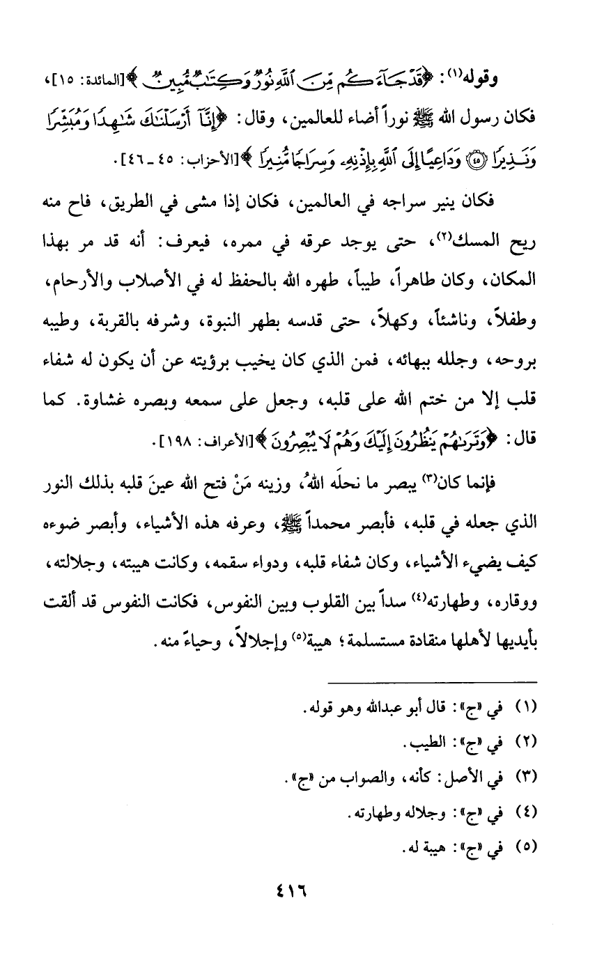 وقوله: {قد جاءكم من الله نورٌ وكتابٌ مبينٌ}، فكان رسول الله صلى الله عليه وسلم نوراً أضاء للعالمين، وقال: {إنا أرسلناك شاهداً ومبشراً ونذيراً. وداعياً إلى الله بإذنه وسراجاً منيراً}.