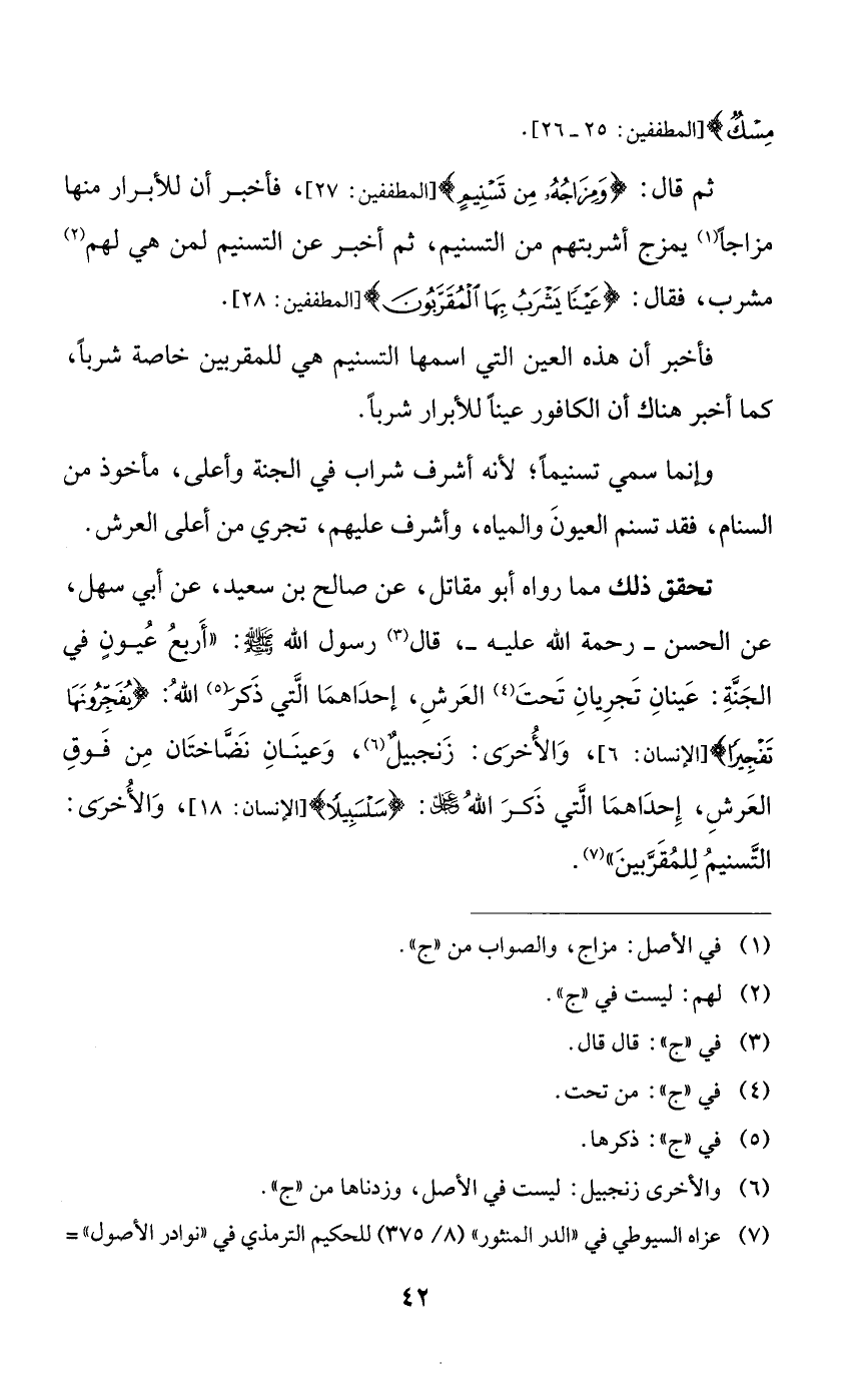 تحقق ذلك مما رواه أبو مقاتل، عن صالح بن سعيد، عن أبي سهل، عن الحسن -رحمة الله عليه-، قال: رسول الله صلى الله عليه وسلم: ((أربع عيونٍ في الجنة: عينان تجريان تحت العرش، إحداهما التي ذكر الله: {يفجرونها تفجيراً}، والأخرى: زنجبيلٌ، وعينان نضاختان من فوق العرش، إحداهما التي ذكر الله عز وجل: {سلسبيلاً}، والأخرى: التسنيم للمقربين.