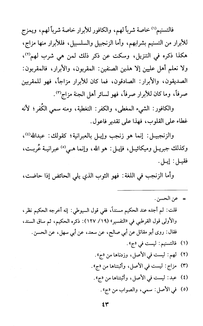 فالتسنيم خاصة شرباً لهم، والكافور للأبرار خاصة شرباً لهم، ويمزج للأبرار من التسنيم بشرابهم، وأما الزنجبيل والسلسبيل، فللأبرار منها مزاج، هكذا ذكره في التنزيل، وسكت عن ذكر ذلك لمن هي شرب لهم، ولا نعلم أهل عليين إلا هذين النصفين: المقربون، والأبرار، فالمقربون: الصديقون، والأبرار: الصادقون، فما كان للأبرار مزاجاً، فهو للمقربين صرفاً، وما كان كان للأبرار صرفاً، فهو لسائر أهل الجنة مزاج.