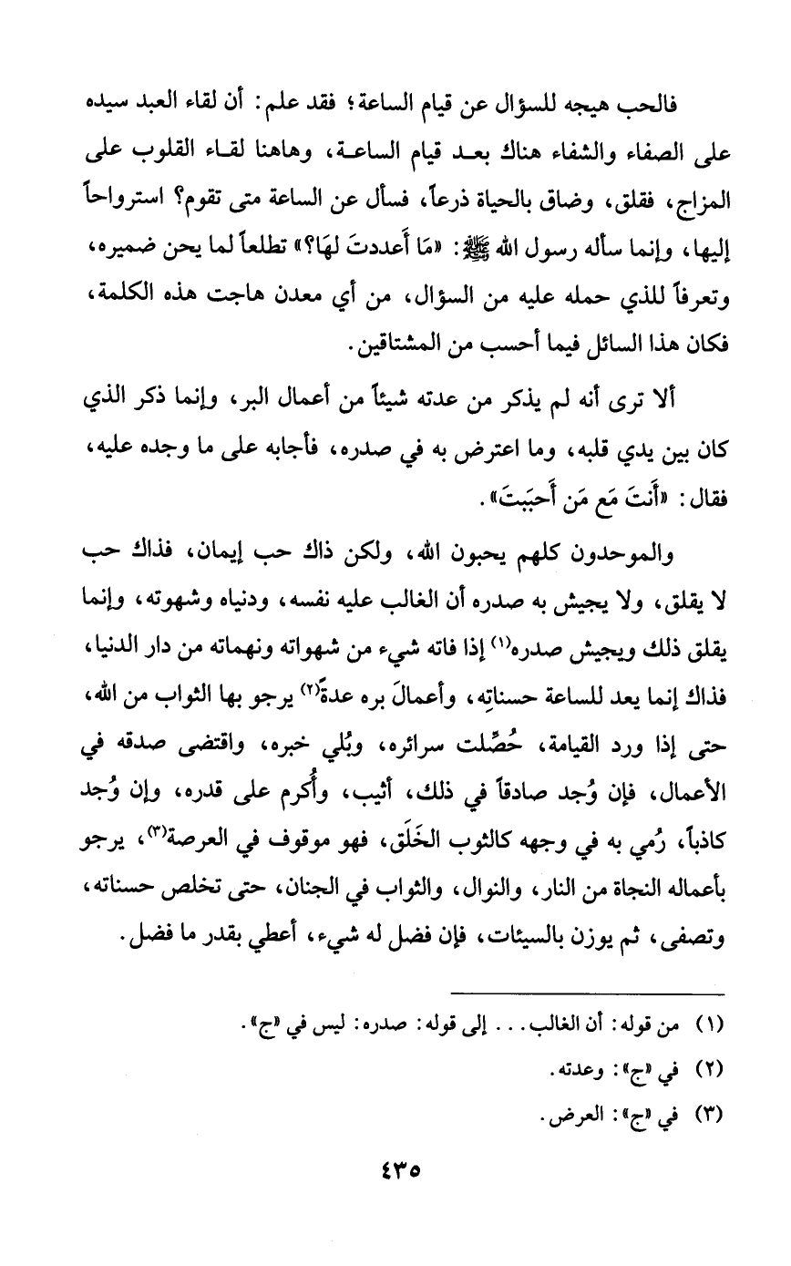 والموحدون كلهم يحبون الله، ولكن ذاك حب إيمان، فذاك حب لا يقلق، ولا يجيش به صدره أن الغالب عليه نفسه، ودنياه وشهوته، وإنما يقلق ذلك ويجيش صدره إذا فاته شيء من شهواته ونهماته من دار الدنيا، فذاك إنما يعد للساعة حسناته، وأعمال بره عدةً يرجو بها الثواب من الله، حتى إذا ورد القيامة، حصلت سرائره، وبلي خبره، واقتضى صدقه في الأعمال، فإن وجد صادقاً في ذلك، أثيب، وأكرم على قدره، وإن وجد كاذباً، رمي به في وجهه كالثوب الخلق، فهو موقوف في العرصة، يرجو بأعماله النجاة من النار، والنوال، والثواب في الجنان، حتى تخلص حسناته، وتصفى، ثم يوزن بالسيئات، فإن فضل له شيء، أعطي بقدر ما فضل.