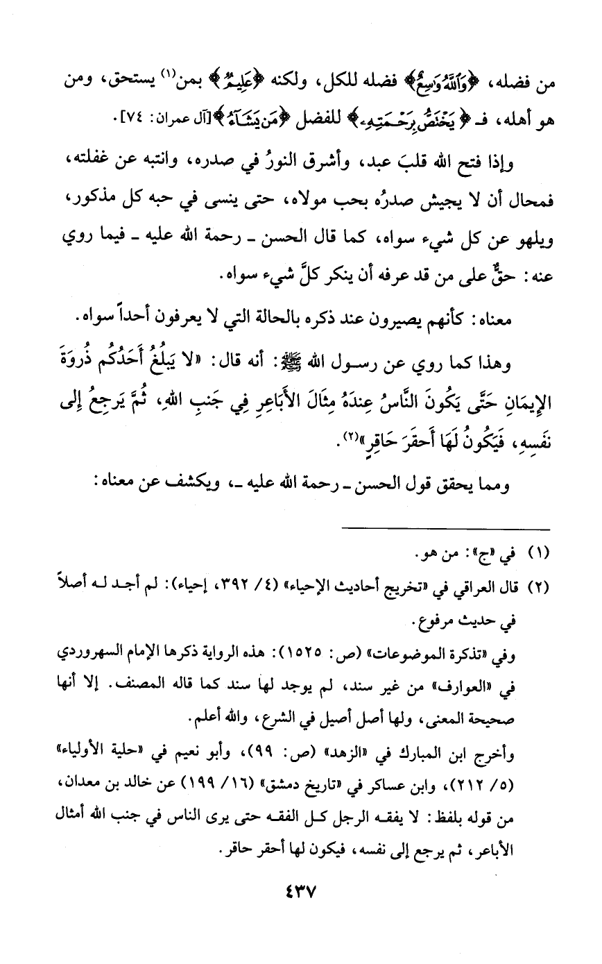 وهذا كما روي عن رسول الله صلى الله عليه وسلم: أنه قال: ((لا يبلغ أحدكم ذروة الإيمان حتى يكون الناس عنده مثال الأباعر في جنب الله، ثم يرجع إلى نفسه، فيكون لها أحقر حاقرٍ)).