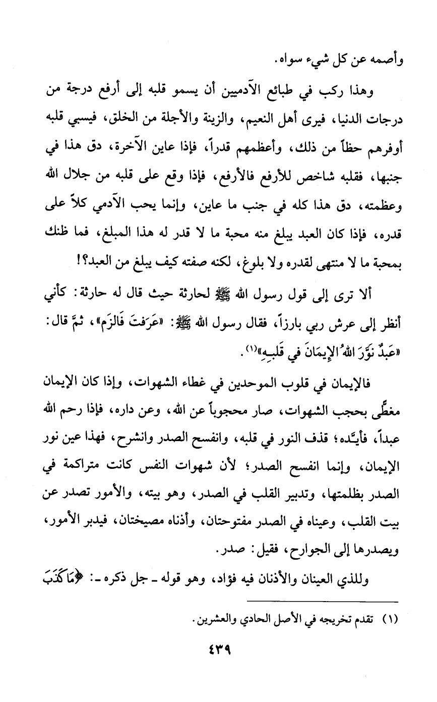 ألا ترى إلى قول رسول الله صلى الله عليه وسلم لحارثة حيث قال له حارثة: كأني أنظر إلى عرش ربي بارزاً، فقال رسول الله صلى الله عليه وسلم: ((عرفت فالزم))، ثم قال: ((عبدٌ نور الله الإيمان في قلبه)).