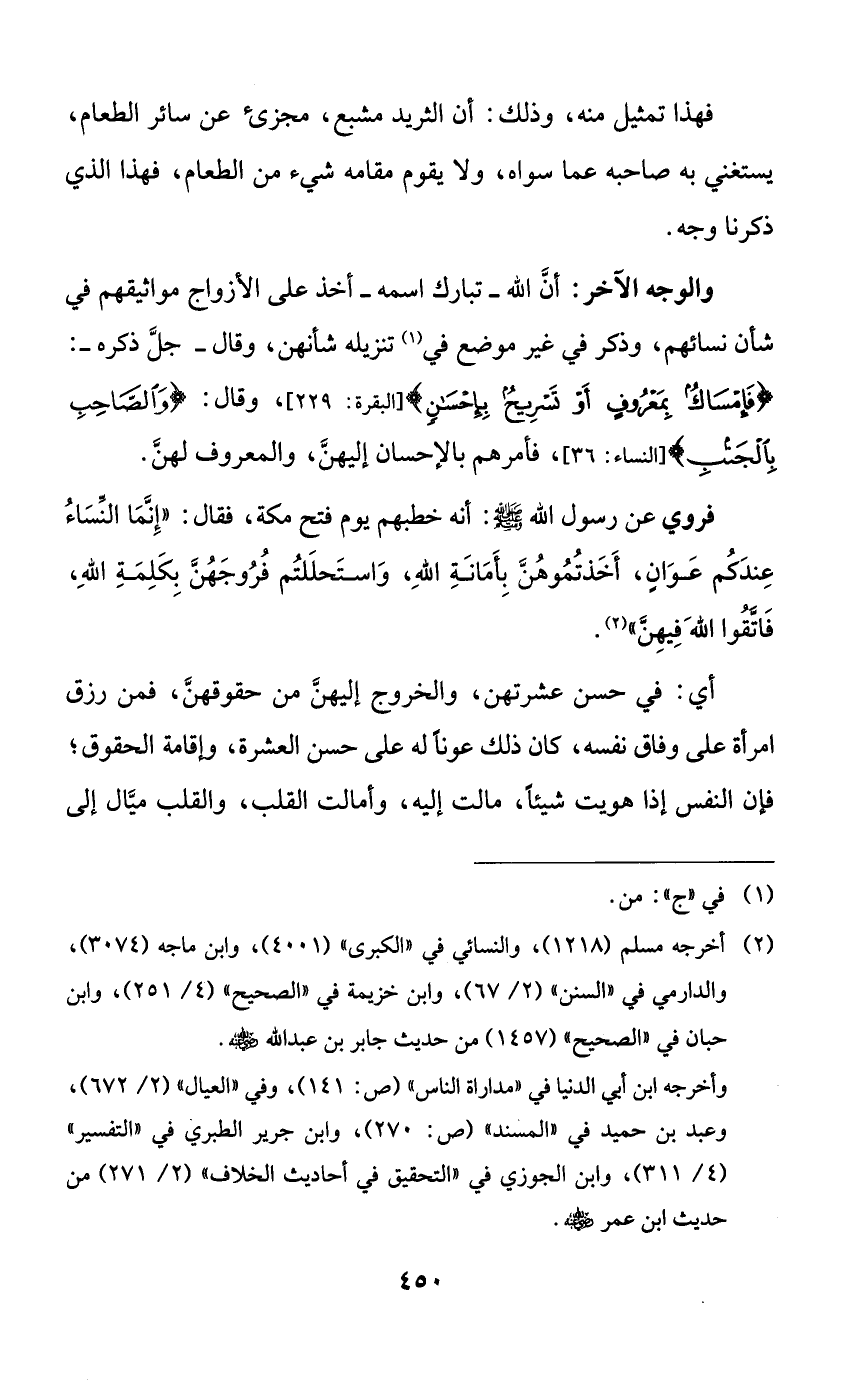 والوجه الآخر: أن الله -تبارك اسمه- أخذ على الأزواج مواثيقهم في شأن نسائهم، وذكر في غير موضع في تنزيله شأنهن، وقال -جل ذكره-: {فإمساكٌ بمعروفٍ أو تسريحٌ بإحسانٍ}، وقال: {والصاحب بالجنب}، فأمرهم بالإحسان إليهن، والمعروف لهن.