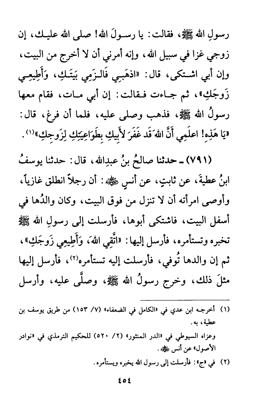 791 - حدثنا صالح بن عبد الله، قال: حدثنا يوسف ابن عطية، عن ثابتٍ، عن أنسٍ رضي الله عنه: أن رجلاً انطلق غازياً، وأوصى امرأته أن لا تنزل من فوق البيت، وكان والدها في أسفل البيت، فاشتكى أبوها، فأرسلت إلى رسول الله صلى الله عليه وسلم تخبره وتستأمره، فأرسل إليها: ((اتقي الله، وأطيعي زوجك))، ثم إن والدها توفي، فأرسلت إليه تستأمره، فأرسل إليها مثل ذلك، وخرج رسول الله صلى الله عليه وسلم، وصلى عليه، وأرسل