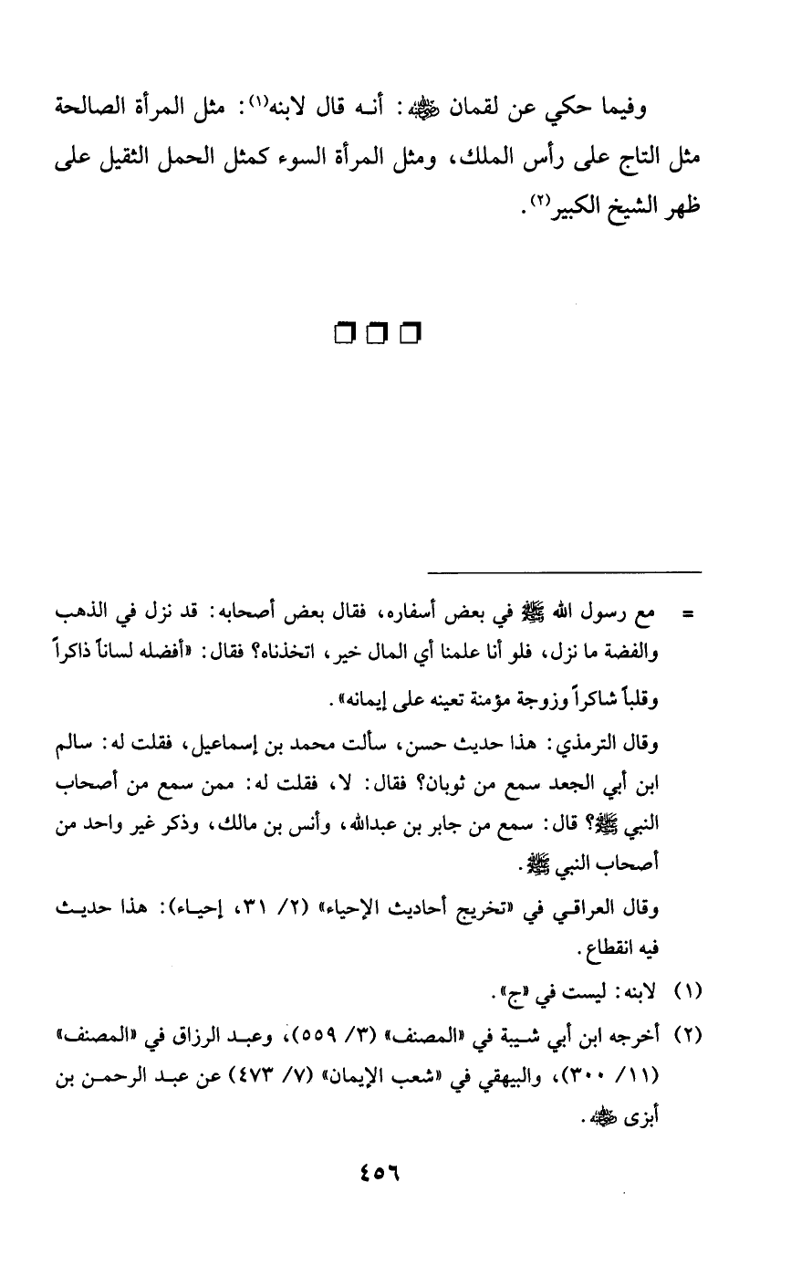 وفيما حكي عن لقمان رضي الله عنه: أنه قال لابنه: مثل المرأة الصالحة مثل التاج على رأس الملك، ومثل المرأة السوء كمثل الحمل الثقيل على ظهر الشيخ الكبير.