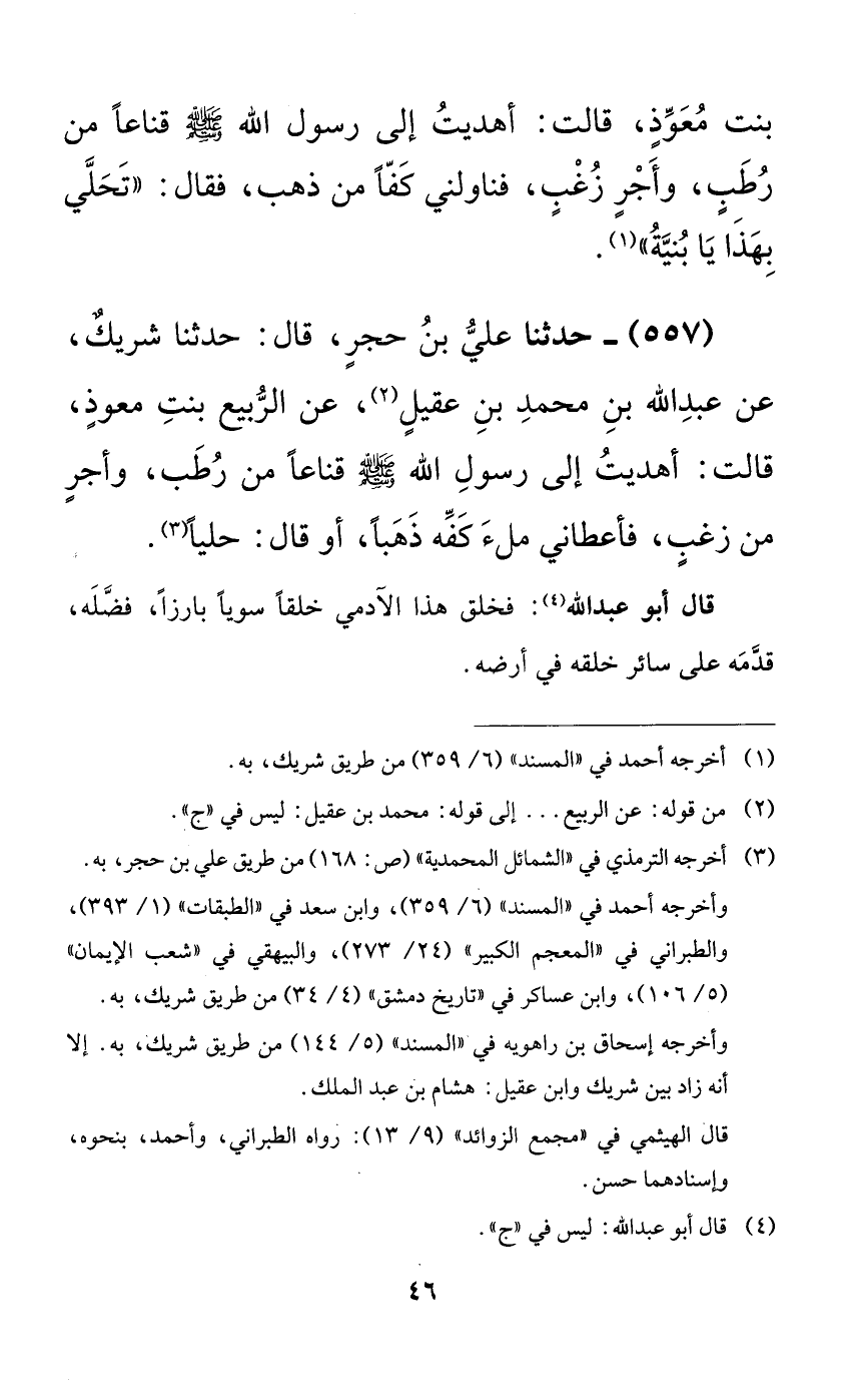 557 - حدثنا علي بن حجرٍ، قال: حدثنا شريكٌ، عن عبد الله بن محمد بن عقيلٍ، عن الربيع بنت معوذٍ، قالت: أهديت إلى رسول الله صلى الله عليه وسلم قناعاً من رطب، وأجرٍ من زغبٍ، فأعطاني ملء كفه ذهباً، أو قال: حلياً.