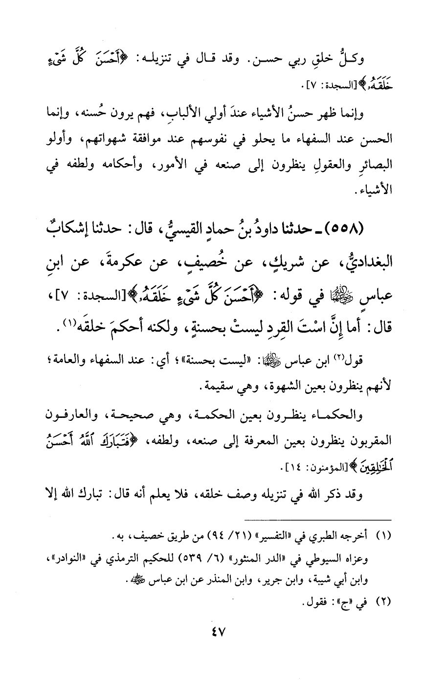 558 - حدثنا داود بن حمادٍ القيسي، قال: حدثنا إشكابٌ البغدادي، عن شريكٍ، عن خصيفٍ، عن عكرمة، عن ابن عباسٍ رضي الله عنهما في قوله: {أحسن كل شيءٍ خلقه}، قال: أما إن است القرد ليست بحسنةٍ، ولكنه أحكم خلقه)).