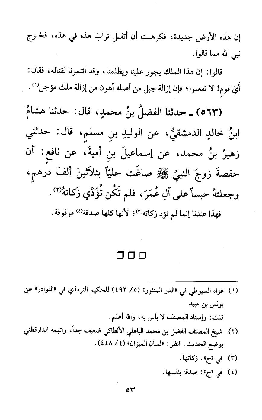 563 - حدثنا الفضل بن محمدٍ، قال: حدثنا هشام ابن خالدٍ الدمشقي، عن الوليد بن مسلمٍ، قال: حدثني زهير بن محمد، عن إسماعيل بن أمية، عن نافعٍ: أن حفصة زوج النبي صلى الله عليه وسلم صاغت حلياً بثلاثين ألف درهمٍ، وجعلته حبساً على آل عمر، فلم تكن تؤدي زكاته.