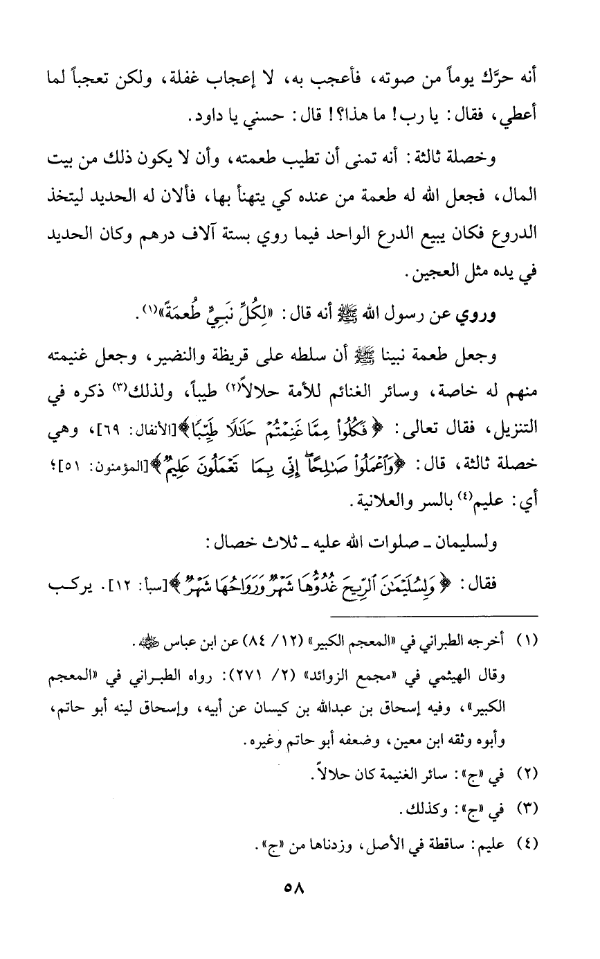 وخصلة ثالثة: أنه تمنى أن تطيب طعمته، وأن لا يكون ذلك من بيت المال، فجعل الله له طعمة من عنده كي يتهنأ بها، فألان له الحديد ليتخذ الدروع فكان يبيع الدرع الواحد فيما روي بستة آلاف درهم وكان الحديد في يده مثل العجين.