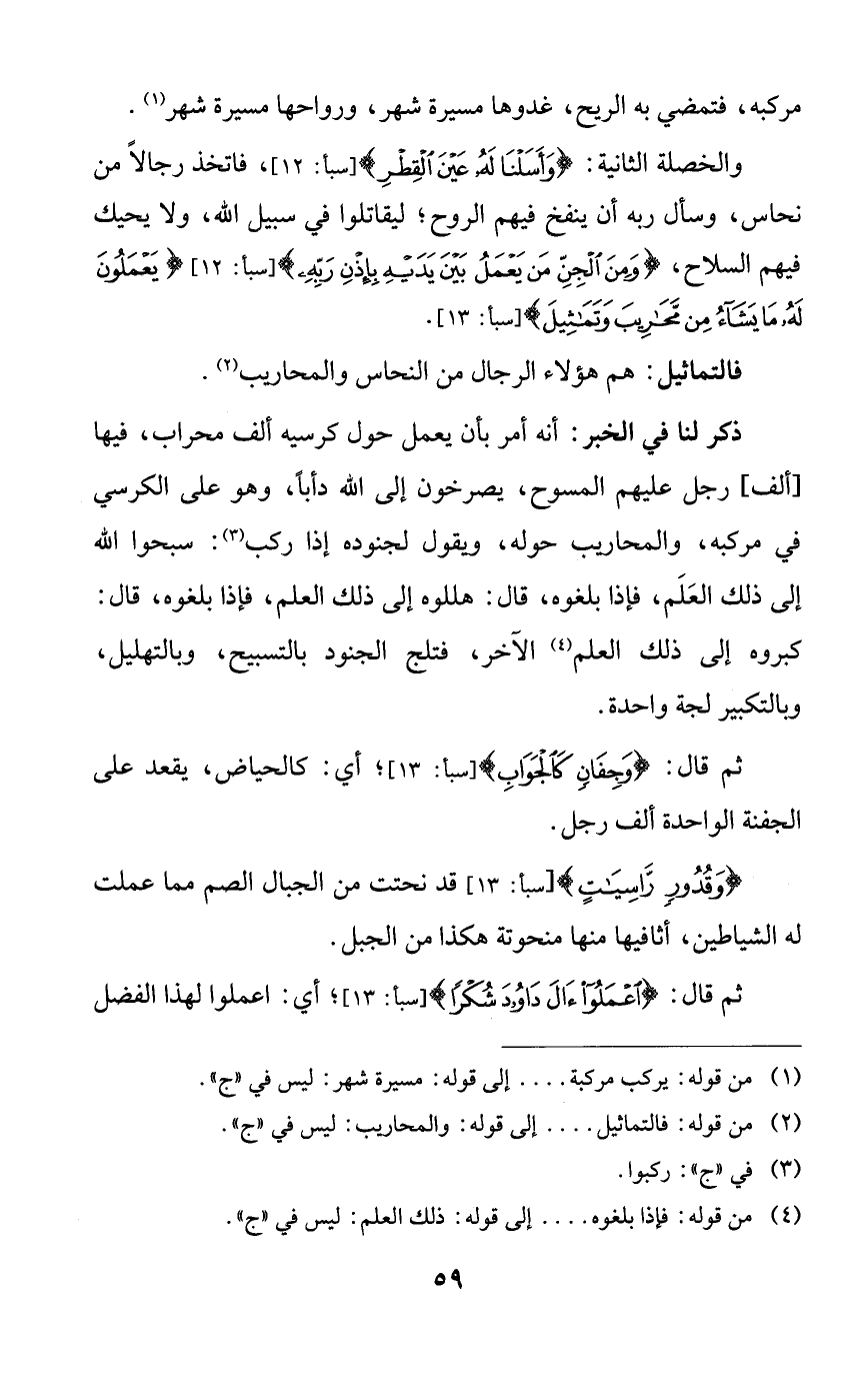 والخصلة الثانية: {وأسلنا له عين القطر}، فاتخذ رجالاً من نحاس، وسأل ربه أنه ينفخ فيهم الروح؛ ليقاتلوا في سبيل الله، ولا يحيك فيهم السلاح، {ومن الجن من يعمل بين يديه بإذن ربه} {يعملون له ما يشاء من محاريب وتماثيل}.