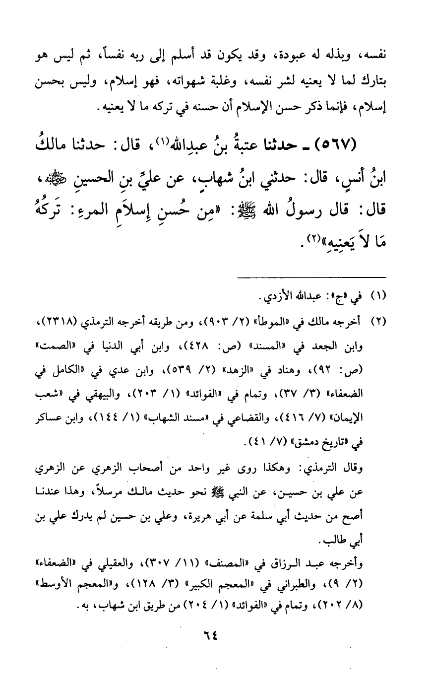 567 - حدثنا عتبة بن عبد الله، قال: حدثنا مالك ابن أنسٍ، قال: حدثني ابن شهابٍ، عن عليٍّ بن الحسين رضي الله عنه، قال: قال رسول الله صلى الله عليه وسلم: ((من حسن إسلام المرء: تركه ما لا يعنيه)).