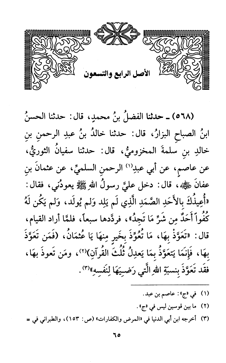 568 - حدثنا الفضل بن محمدٍ، قال: حدثنا الحسن ابن الصباح البزار، قال: حدثنا خالد بن عبد الرحمن بن خالد بن سلمة المخزومي، قال: حدثنا سفيان الثوري، عن عاصمٍ، عن أبي عبد الرحمن السلمي، عن عثمان بن عفان رضي الله عنه، قال: دخل علي رسول الله صلى الله عليه وسلم يعودني، فقال: ((أعيذك بالأحد الصمد الذي لم يلد ولم يولد، ولم يكن له كفواً أحدٌ من شر ما تجد))، فرددها سبعاً، فلما أراد القيام، قال: ((تعوذ بها، ما تعوذ بخيرٍ منها يا عثمان، (فمن تعوذ بها، فإنما يتعوذ بما يعدل ثلث القرآن)، ومن تعوذ بها فقد تعوذ بنسبة الله التي رضيها لنفسه)).