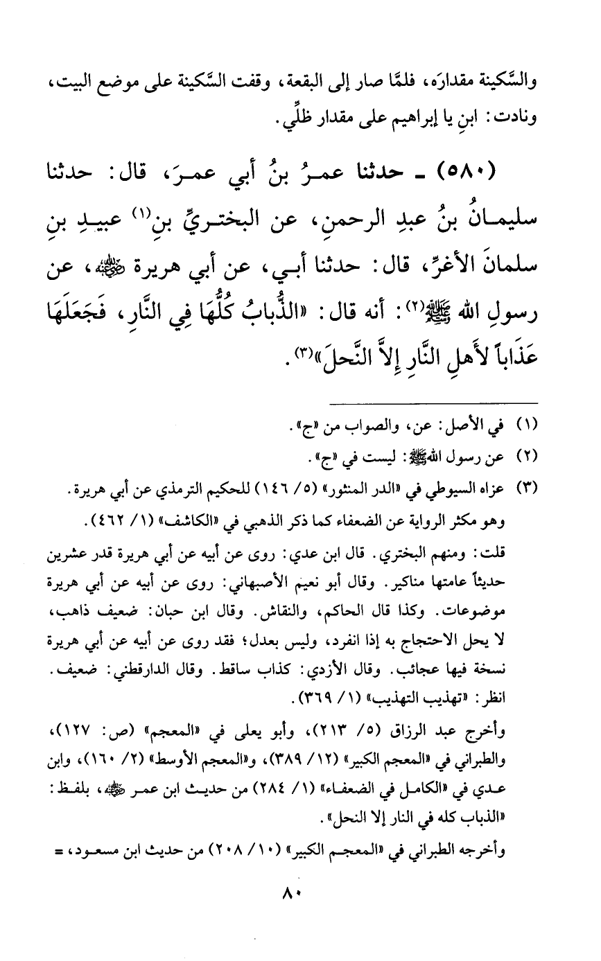 580 - حدثنا عمر بن أبي عمر، قال: حدثنا سليمان بن عبد الرحمن، عن البختري بن عبيدٍ بن سلمان الأغر، قال: حدثنا أبي، عن أبي هريرة رضي الله عنه، عن رسول الله صلى الله عليه وسلم: أنه قال: ((الذباب كلها في النار، فجعلها عذاباً لأهل النار إلا النحل)).
