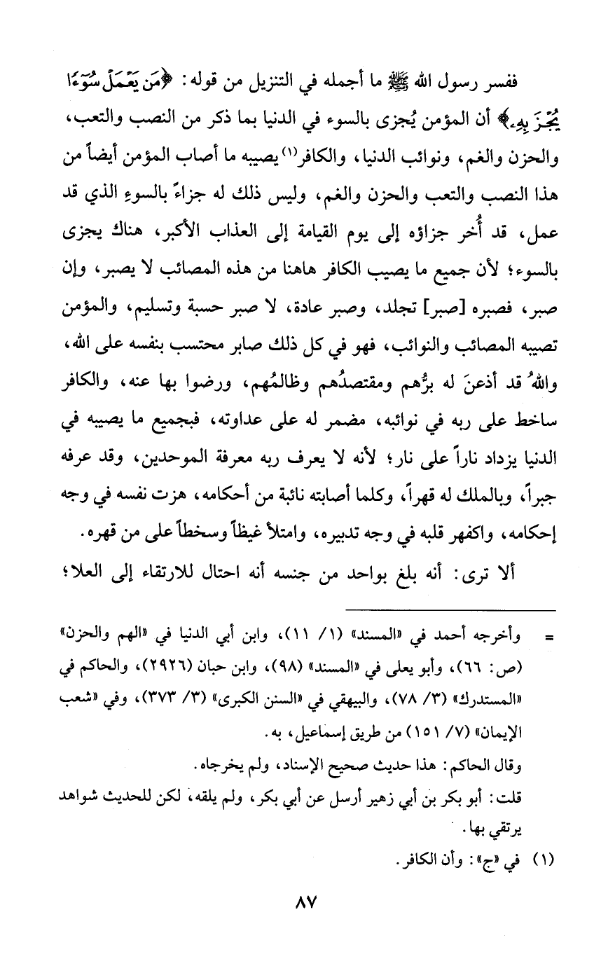 ففسر رسول الله صلى الله عليه وسلم ما أجمله في التنزيل من قوله: {من يعمل سوءًا يجز به} أن المؤمن يجزى بالسوء في الدنيا بما ذكر من النصب والتعب، والحزن والغم، ونوائب الدنيا، والكافر يصيبه ما أصاب المؤمن أيضاً من هذا النصب والتعب والحزن والغم، وليس ذلك له جزاءً بالسوء الذي قد عمل، قد أخر جزاؤه إلى يوم القيامة إلى العذاب الأكبر، هناك يجزى بالسوء؛ لأن جميع ما يصيب الكافر هاهنا من هذه المصائب لا يصبر، وإن صبر، فصبره [صبر] تجلد، وصير عادة، لا صبر حسبة وتسليم، والمؤمن تصيبه المصائب والنوائب، فهو في كل ذلك صابر محتسب بنفسه على الله، والله قد أذعن له برهم ومقتصدهم وظالمهم، ورضوا بها عنه، والكافر ساخط على ربه في نوائبه، مضمر له على عداوته، فبجميع ما يصيبه في الدنيا يزداد ناراً على نار؛ لأنه لا يعرف ربه معرفة الموحدين، وقد عرفه جبراً، وبالملك له قهراً، وكلما أصابته نائبة من أحكامه، هزت نفسه في وجه إحكامه، واكفهر قلبه في وجه تدبيره، وامتلأ غيظاً وسخطاً على من قهره.