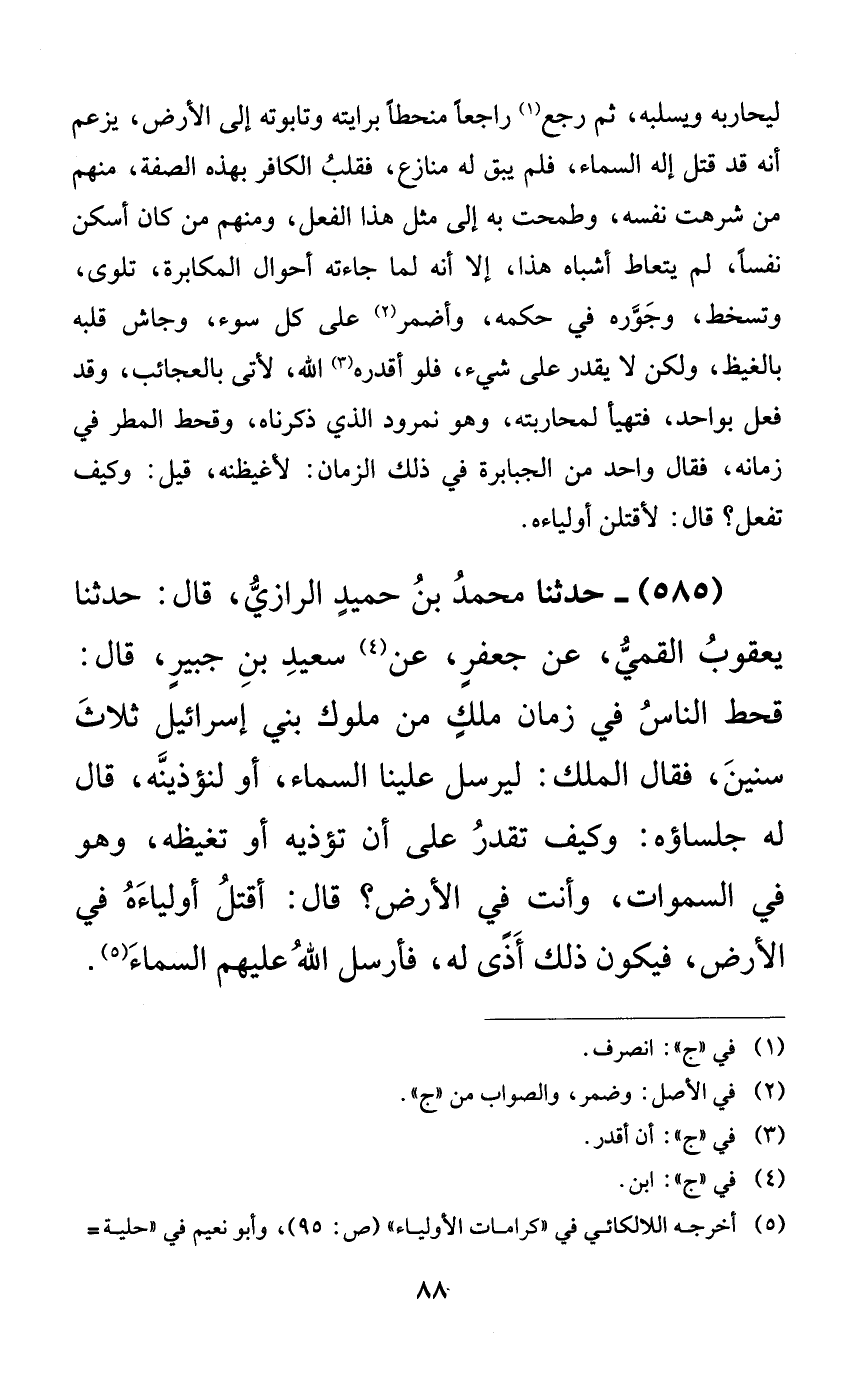 585 - حدثنا محمد بن حميدٍ الرازي، قال: حدثنا يعقوب القمي، عن جعفرٍ، عن سعيد بن جبيرٍ، قال: قحط الناس في زمان ملكٍ من ملوك بني إسرائيل ثلاث سنين، فقال الملك: ليرسل علينا السماء، أو لنؤذينه، قال له جلساؤه: وكيف تقدر أن تؤذيه أو تغيظه، وهو في السماوات، وأنت في الأرض؟ قال: أقتل أولياءه في الأرض، فيكون ذلك أذى له، فأرسل الله عليهم السماء.