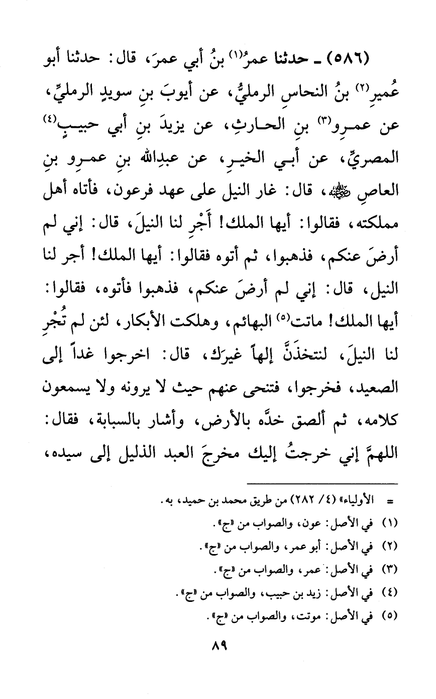 586 - حدثنا عمر بن أبي عمر، قال: حدثنا أبو عمير بن النحاس الرملي، عن أيوب بن سويد الرملي، عن عمرو بن الحارث، عن يزيد بن أبي حبيبٍ المصري، عن أبي الخير، عن عبد الله بن عمرو بن العاص رضي الله عنه، قال: غار النيل على عهد فرعون، فأتاه أهل مملكته، فقالوا: أيها الملك! أجر لنا النيل، قال: إني لم أرض عنكم، فذهبوا، ثم أتوه فقالوا: أيها الملك! أجر لنا النيل، قال: إني لم أرض عنكم، فذهبوا فأتوه، فقالوا: أيها الملك! ماتت البهائم، وهلكت الأبكار، لئن لم تجر لنا النيل، لنتخذن إلهاً غيرك، قال: اخرجوا غداً إلى الصعيد، فخرجوا، فتنحى عنهم حيث لا يرونه ولا يسمعون كلامه، ثم ألصق خده بالأرض، وأشار بالسبابة، فقال: اللهم إني خرجت إليك مخرج العبد الذليل إلى سيده