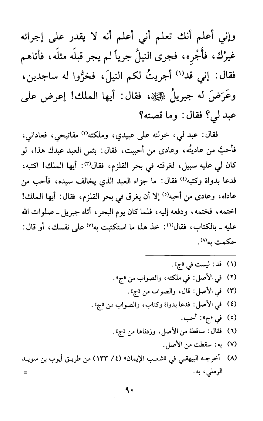 فقال: عبد لي، خولته على عبيدي، وملكته مفاتيحي، فعاداني، فأحب من عاديته، وعادى من أحببت، فقال: بئس العبد عبدك هذا، لو كان لي عليه سبيل، لغرقته في بحر القلزم، فقال: أيها الملك! اكتبه، فدعا بدواة وكتبه فقال: ما جزاء العبد الذي يخالف سيده، فأحب من عاداه، وعادى من أحبه إلا أن يغرق في بحر القلزم، فقال: أيها الملك! اختمه، فختمه، ودفعه إليه، فلما كان يوم البحر، أتاه جبريل -صلوات الله عليه- بالكتاب، فقال: خذ هذا ما استكتبت به على نفسك، أو قال: حكمت به.