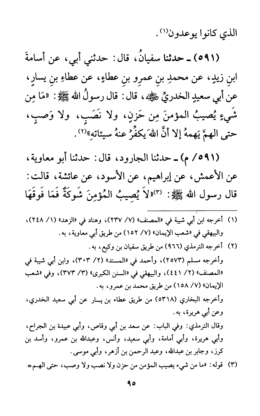 591 - حدثنا سفيان، قال: حدثني أبي، عن أسامة ابن زيدٍ، عن محمد بن عمرو بن عطاءٍ، عن عطاء بن يسارٍ، عن أبي سعيدٍ الخدري رضي الله عنه، قال: قال رسول الله صلى الله عليه وسلم: ((ما من شيءٍ يصيب المؤمن من حزنٍ، ولا نصبٍ، ولا وصبٍ، حتى الهم يهمه إلا أن الله يكفر عنه سيئاته)).