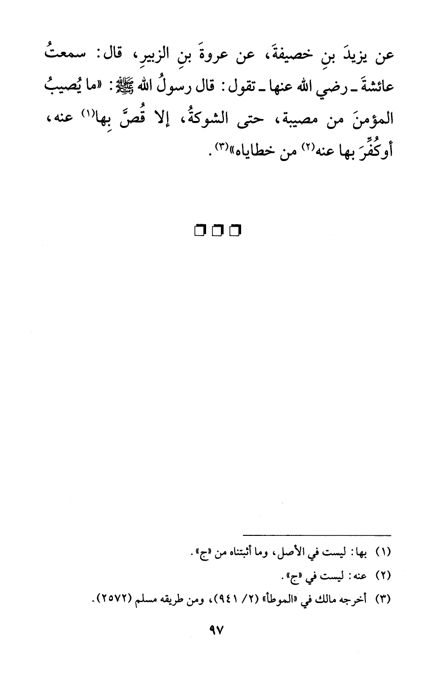 عن يزيد بن خصيفة، عن عروة بن الزبير، قال: سمعت عائشة -رضي الله عنها- تقول: قال رسول الله صلى الله عليه وسلم: ((ما يصيب المؤمن من مصيبة، حتى الشوكة، إلا قص بها عنه، أو كفر بها عنه من خطايا.