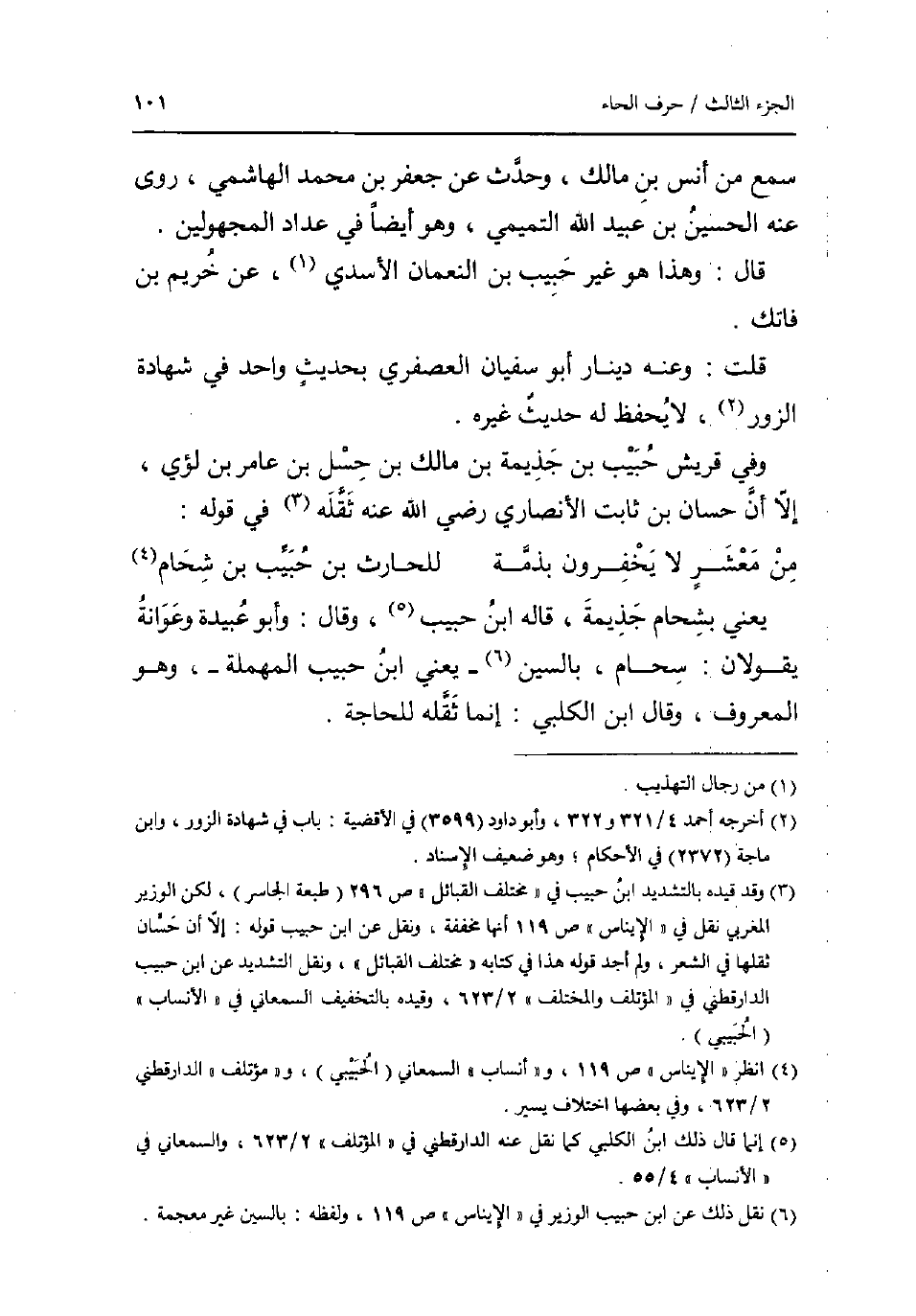 سمع من أنس بن مَالك وَحدث عَن جَعْفَر بن مُحَمَّد الْهَاشِمِي روى عَنهُ الْحُسَيْن بن عبيد الله التَّمِيمِي وَهُوَ أَيْضا فِي عداد المجهولين. قَالَ: وَهَذَا هُوَ غير حبيب بن النُّعْمَان الْأَسدي عَن خريم بن فاتك. قلت: وَعنهُ دِينَار أَبُو سُفْيَان الْعُصْفُرِي بِحَدِيث وَاحِد فِي شَهَادَة الزُّور لَا يحفظ لَهُ حَدِيث غَيره. وَفِي قُرَيْش حبيب بن جذيمة بن مَالك بن حسل بن عَامر بن لؤَي إِلَّا أَن حسان بن ثَابت الْأنْصَارِيّ رَضِي الله عَنهُ ثقله فِي قَوْله: