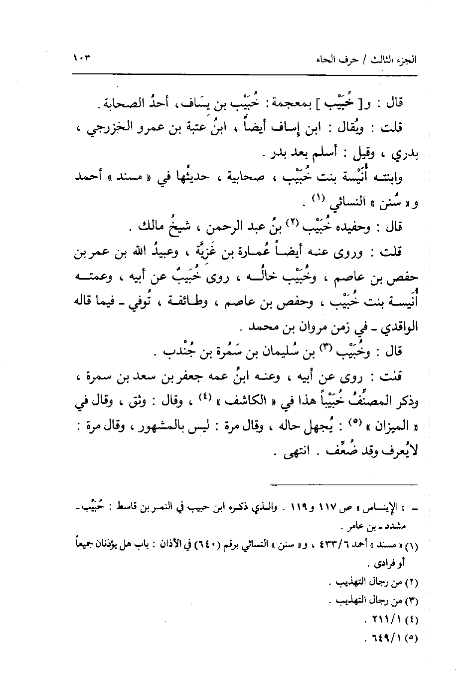 قَالَ: و [خبيب] بِمُعْجَمَة: خبيب بن يسَاف أحد الصَّحَابَة. قلت: وَيُقَال: ابْن إساف أَيْضا ابْن عتبَة بن عَمْرو الخزرجي بَدْرِي وَقيل: أسلم بعد بدر. وَابْنَته أنيسَة بنت خبيب صحابية حَدِيثهَا فِي مُسْند أَحْمد وَسنَن النَّسَائِيّ. قَالَ: وحفيده خبيب بن عبد الرَّحْمَن شيخ مَالك. قلت: وروى عَنهُ أَيْضا عمَارَة بن غزيَّة وَعبيد الله بن عمر بن حَفْص بن عَاصِم وخبيب خَاله روى خبيب عَن أَبِيه وَعَمَّته أنيسَة بنت خبيب وَحَفْص بن عَاصِم وَطَائِفَة توفّي _ فِيمَا قَالَه الْوَاقِدِيّ _ فِي زمن مَرْوَان بن مُحَمَّد. قَالَ: وخبيب بن سُلَيْمَان بن سَمُرَة بن جُنْدُب. قلت: روى عَن أَبِيه وَعنهُ ابْن عَمه جَعْفَر بن سعد بن سَمُرَة وَذكر المُصَنّف خبيبا هَذَا فِي الكاشف وَقَالَ: وثق وَقَالَ فِي الْمِيزَان: يجهل حَاله وَقَالَ مرّة: لَيْسَ بالمشهور وَقَالَ مرّة: لَا يعرف وَقد ضعف. انْتهى.