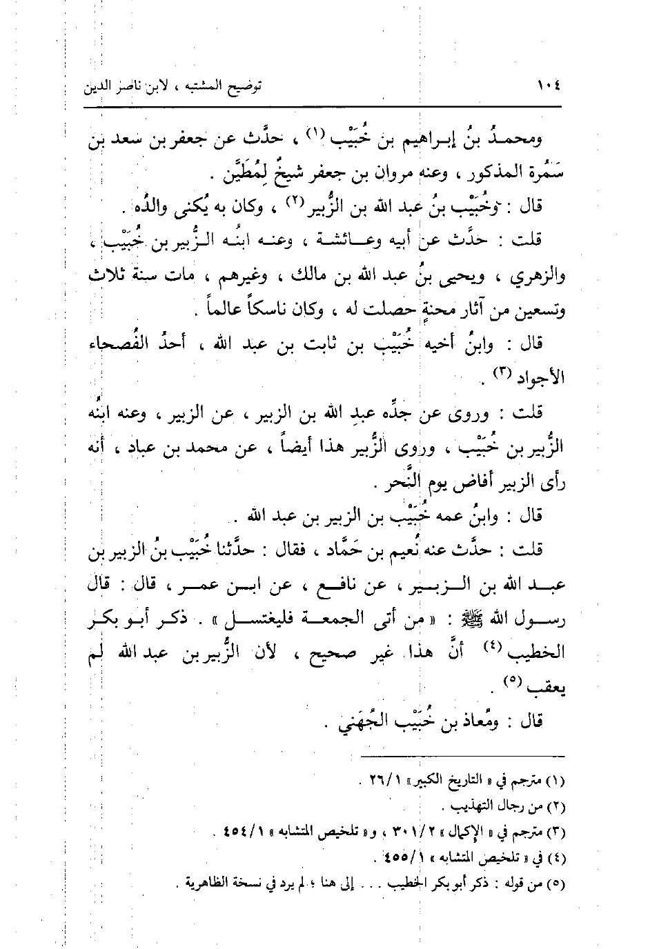 وَمُحَمّد بن إِبْرَاهِيم بن خبيب حدث عَن جَعْفَر بن سعد بن سَمُرَة الْمَذْكُور وَعنهُ مَرْوَان بن جَعْفَر شيخ لمطين. قَالَ: وخبيب بن عبد الله بن الزبير وَكَانَ بِهِ يكنى وَالِده. قلت: حدث عَن أَبِيه وَعَائِشَة وَعنهُ ابْنه الزبير بن خبيب وَالزهْرِيّ وَيحيى بن عبد الله بن مَالك وَغَيرهم مَاتَ سنة ثَلَاث وَتِسْعين من آثَار محنة حصلت لَهُ وَكَانَ ناسكا عَالما. قَالَ: وَابْن أَخِيه خبيب بن ثَابت بن عبد الله أحد الفصحاء الأجواد. قلت: وروى عَن جده عبد الله بن الزبير عَن الزبير وَعنهُ ابْنه الزبير بن خبيب وروى الزبير هَذَا أَيْضا عَن مُحَمَّد بن عباد أَنه رأى الزبير أَفَاضَ يَوْم النَّحْر. قَالَ: وَابْن عَمه خبيب بن الزبير بن عبد الله. قلت: حدث عَنهُ نعيم بن حَمَّاد فَقَالَ: حَدثنَا خبيب بن الزبير بن عبد الله بن الزبير عَن نَافِع عَن ابْن عمر قَالَ: قَالَ رَسُول الله صلى الله عَلَيْهِ وَسلم: من أَتَى الْجُمُعَة فليغتسل. ذكر أَبُو بكر الْخَطِيب أَن هَذَا غير صَحِيح لِأَن الزبير بن عبد الله لم يعقب. قَالَ: ومعاذ بن خبيب الْجُهَنِيّ.