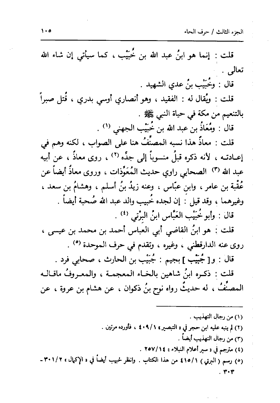 قلت: إِنَّمَا هُوَ ابْن عبد الله بن خبيب كَمَا سَيَأْتِي إِن شَاءَ الله تَعَالَى. قَالَ: وخبيب بن عدي الشَّهِيد. قلت: وَيُقَال لَهُ: الفقيد وَهُوَ أَنْصَارِي أوسي بَدْرِي قتل صبرا بِالتَّنْعِيمِ من مَكَّة فِي حَيَاة النَّبِي صلى الله عَلَيْهِ وَسلم. قَالَ: ومعاذ بن عبد الله بن خبيب الْجُهَنِيّ. قلت: معَاذ هَذَا نسبه المُصَنّف هُنَا على الصَّوَاب لكنه وهم فِي إِعَادَته لِأَنَّهُ ذكره قبل مَنْسُوبا إِلَى جده روى معَاذ عَن أَبِيه عبد الله الصَّحَابِيّ رَاوِي حَدِيث المعوذات وروى معَاذ أَيْضا عَن عقبَة بن عَامر وَابْن عَبَّاس وَعنهُ زيد بن أسلم وَهِشَام بن سعد وَغَيرهمَا وَقد قيل: إِن لجده خبيب وَالِد عبد الله صُحْبَة أَيْضا. قَالَ: وَأَبُو خبيب الْعَبَّاس ابْن البرتي. قلت: هُوَ ابْن القَاضِي أبي الْعَبَّاس أَحْمد بن مُحَمَّد بن عِيسَى روى عَنهُ الدَّارَقُطْنِيّ وَغَيره وَتقدم فِي حرف الْمُوَحدَة. قَالَ: و [جبيب] بجيم: جبيب بن الْحَارِث صَحَابِيّ فَرد. قلت: ذكره ابْن شاهين بِالْخَاءِ الْمُعْجَمَة وَالْمَعْرُوف مَا قَالَه المُصَنّف لَهُ حَدِيث رَوَاهُ نوح بن ذكْوَان عَن هِشَام بن عُرْوَة عَن
