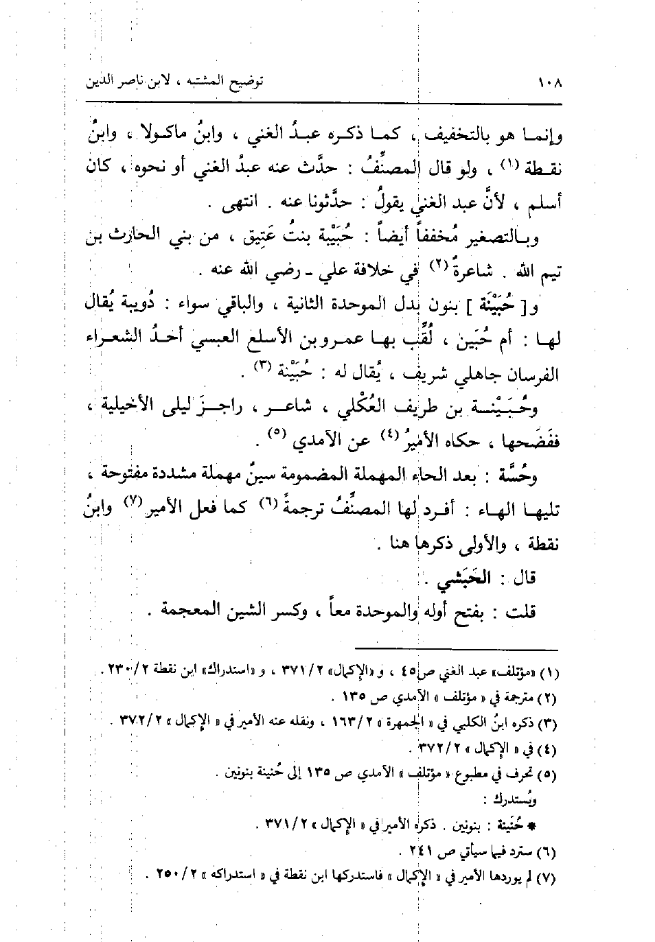 وَإِنَّمَا هُوَ بِالتَّخْفِيفِ كَمَا ذكره عبد الْغَنِيّ وَابْن مَاكُولَا وَابْن نقطة وَلَو قَالَ المُصَنّف حدث عَنهُ عبد الْغَنِيّ أَو نَحوه كَانَ أسلم لِأَن عبد الْغَنِيّ يَقُول: حدثونا عَنهُ. انْتهى. وبالتصغير مخففا أَيْضا: حَبِيبَة بنت عَتيق من بني الْحَارِث بن تيم الله. شاعرة فِي خلَافَة عَليّ _ رَضِي الله عَنهُ. و [حبينة] بنُون بدل الْمُوَحدَة الثَّانِيَة وَالْبَاقِي سَوَاء: دويبة يُقَال لَهَا: أم حبين لقب بهَا عَمْرو بن الأسلع الْعَبْسِي أحد الشُّعَرَاء الفرسان جاهلي شرِيف يُقَال لَهُ: حبينة. وحبينة بن طريف العكلي شَاعِر راجز ليلى الأخيلية ففضحها حَكَاهُ الْأَمِير عَن الْآمِدِيّ. وحسة: بعد الْحَاء الْمُهْملَة المضمومة سين مُهْملَة مُشَدّدَة مَفْتُوحَة تَلِيهَا الْهَاء: أفرد لَهَا المُصَنّف تَرْجَمَة كَمَا فعل الْأَمِير وَابْن نقطة وَالْأولَى ذكرهَا هُنَا. قَالَ: الحبشي. قلت: بِفَتْح أَوله وَالْمُوَحَّدَة مَعًا وَكسر الشين الْمُعْجَمَة.