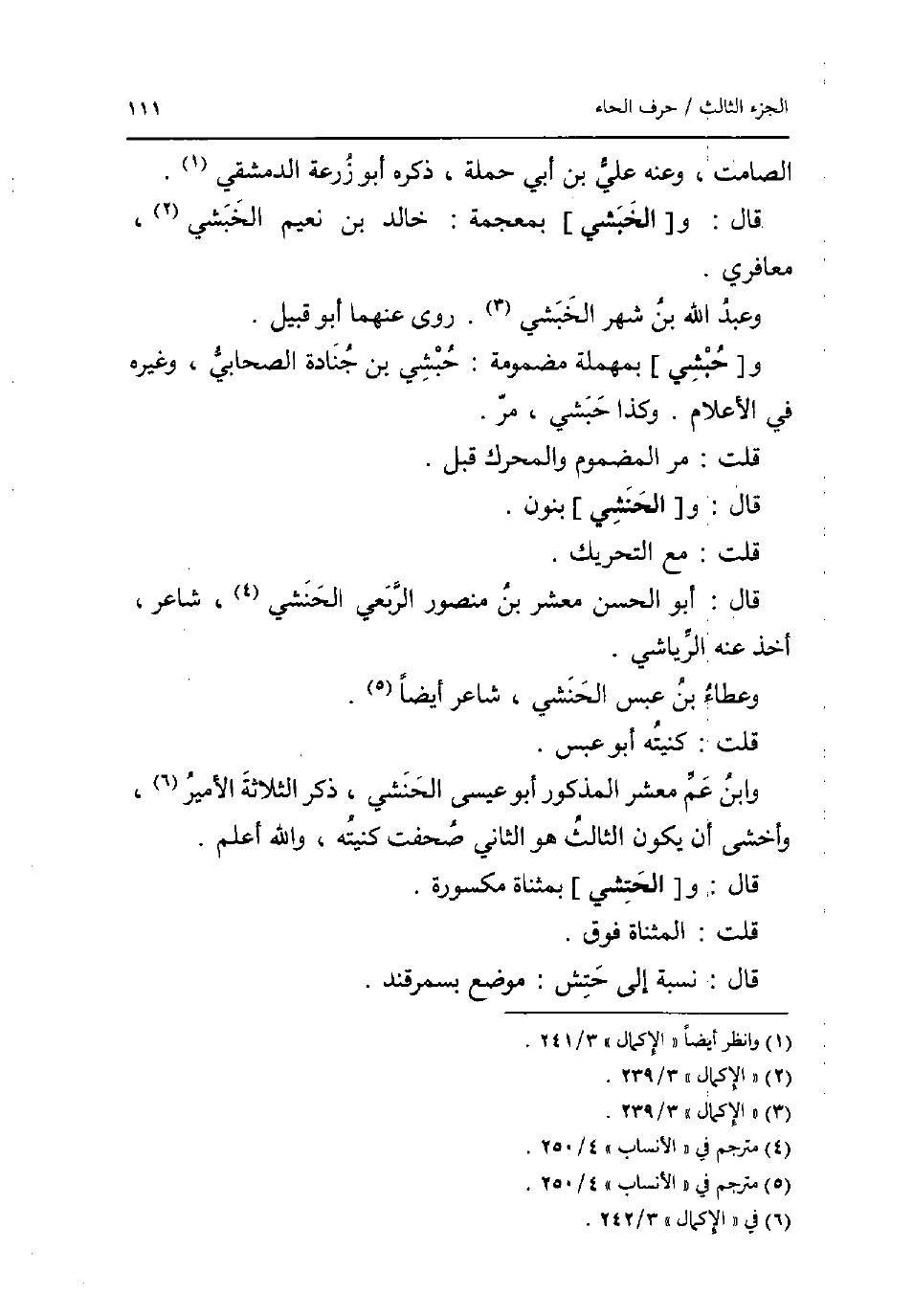 الصَّامِت وَعنهُ عَليّ بن أبي حَملَة ذكره أَبُو زرْعَة الدِّمَشْقِي. قَالَ: و [الخبشي] بِمُعْجَمَة: خَالِد بن نعيم الخبشي معافري وَعقد الله بن شهر الخبشي. روى عَنْهُمَا أَبُو قبيل. و [حبشِي] بِمُهْملَة مَضْمُومَة: حبشِي بن جُنَادَة الصَّحَابِيّ وَغَيره فِي الْأَعْلَام. وَكَذَا حبشِي مر. قلت: مر المضموم والمحرك قبل. قَالَ: و [الحنشي] بنُون. قلت: مَعَ التحريك. قَالَ: أَبُو الْحسن معشر بن مَنْصُور الربعِي الحنشي شَاعِر أَخذ عَنهُ الرياشي. وَعَطَاء بن عبس الحنشي شَاعِر أَيْضا. قلت: كنيته أَبُو عبس. وَابْن عَم معشر الْمَذْكُور أَبُو عِيسَى الحنشي ذكر الثَّلَاثَة الْأَمِير وأخشى أَن يكون الثَّالِث هُوَ الثَّانِي صحفت كنيته وَالله أعلم. قَالَ: و [الحتشي] بمثناة مَكْسُورَة. قلت: الْمُثَنَّاة فَوق. قَالَ: نِسْبَة إِلَى حتش: مَوضِع بسمرقند.
