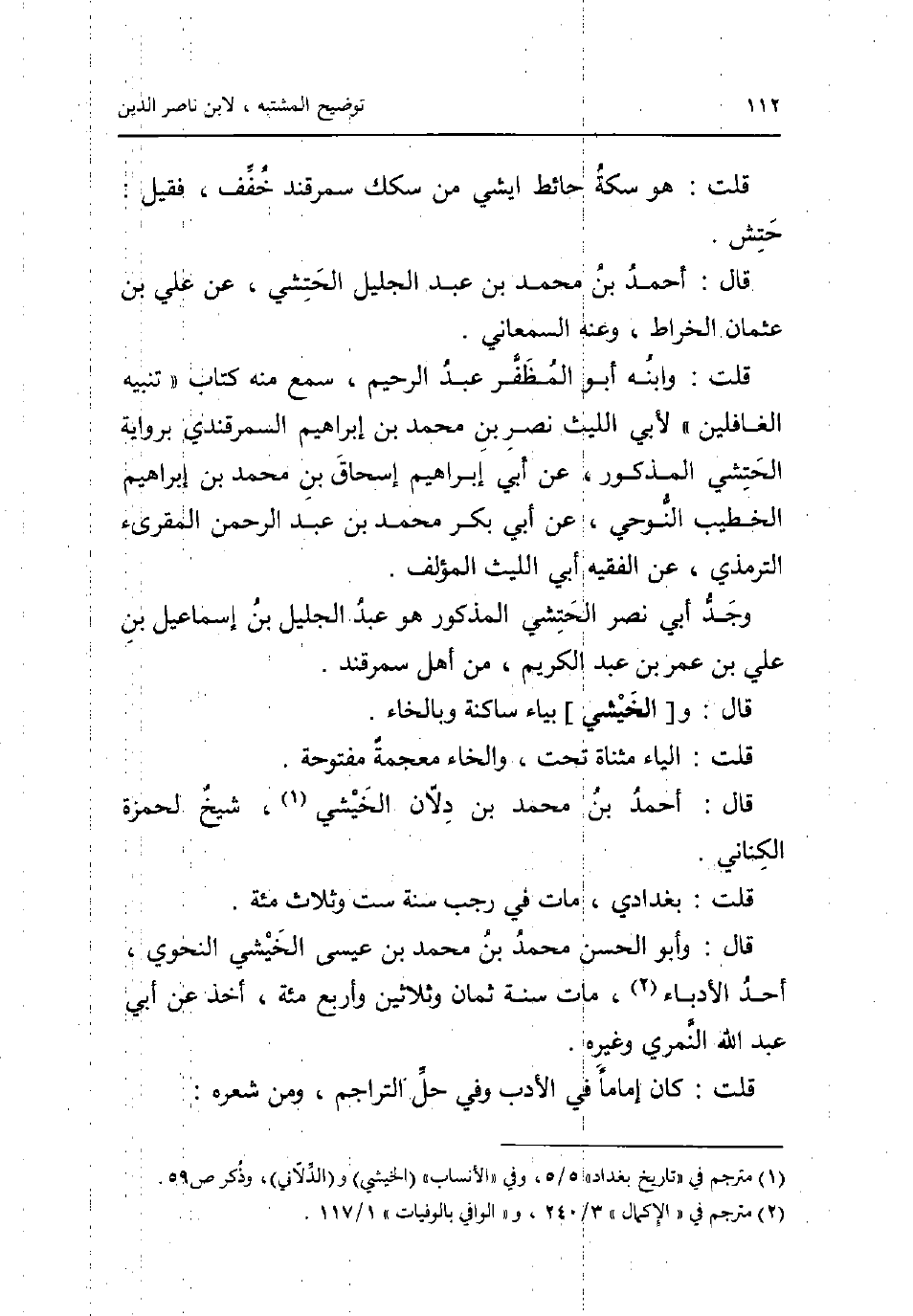 قلت: هُوَ سكَّة حَائِط ايشي من سِكَك سَمَرْقَنْد خفف فَقيل: حتش. قَالَ: أَحْمد بن مُحَمَّد بن عبد الْجَلِيل الحتشي عَن عَليّ بن عُثْمَان الْخَرَّاط وَعنهُ السَّمْعَانِيّ. قلت: وَابْنه أَبُو المظفر عبد الرَّحِيم سمع مِنْهُ كتاب تَنْبِيه الغافلين لأبي اللَّيْث نصر بن مُحَمَّد بن إِبْرَاهِيم السَّمرقَنْدِي بِرِوَايَة الحتشي الْمَذْكُور عَن أبي إِبْرَاهِيم إِسْحَاق بن مُحَمَّد بن إِبْرَاهِيم الْخَطِيب النوحي عَن أبي بكر مُحَمَّد بن عبد الرَّحْمَن الْمُقْرِئ التِّرْمِذِيّ عَن الْفَقِيه أبي اللَّيْث الْمُؤلف. وجد أبي نصر الحتشي الْمَذْكُور هُوَ عبد الْجَلِيل بن إِسْمَاعِيل بن عَليّ بن عمر بن عبد الْكَرِيم من أهل سَمَرْقَنْد. قَالَ: و [الخيشي] بياء سَاكِنة وبالخاء. قلت: الْيَاء مثناة تَحت وَالْخَاء مُعْجمَة مَفْتُوحَة. قَالَ: أَحْمد بن مُحَمَّد بن دلان الخيشي شيخ لِحَمْزَة الْكِنَانِي. قلت: بغدادي مَاتَ فِي رَجَب سنة سِتّ وَثَلَاث مئة. قَالَ: وَأَبُو الْحسن مُحَمَّد بن مُحَمَّد بن عِيسَى الخيشي النَّحْوِيّ أحد الأدباء مَاتَ سنة ثَمَان وَثَلَاثِينَ وَأَرْبع مئة أَخذ عَن أبي عبد الله النمري وَغَيره. قلت: كَانَ إِمَامًا فِي الْأَدَب وَفِي حل التراجم وَمن شعره: