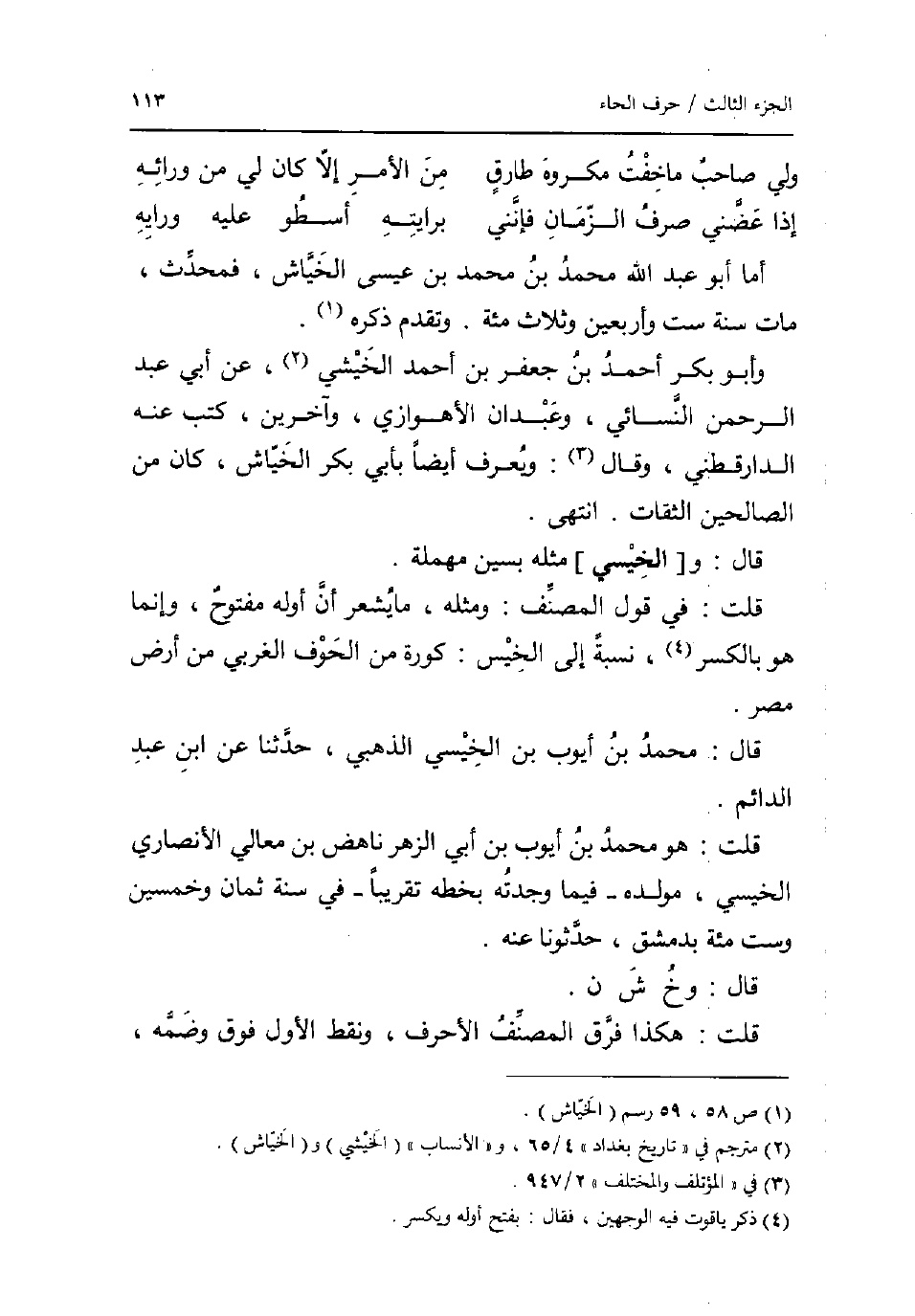 أما أَبُو عبد الله مُحَمَّد بن مُحَمَّد بن عِيسَى الخياش فمحدث مَاتَ سنة سِتّ وَأَرْبَعين وَثَلَاث مئة. وَتقدم ذكره. وَأَبُو بكر أَحْمد بن جَعْفَر بن أَحْمد الخيشي عَن أبي عبد الرَّحْمَن النَّسَائِيّ وعبدان الْأَهْوَازِي وَآخَرين كتب عَنهُ الدَّارَقُطْنِيّ وَقَالَ: وَيعرف أَيْضا بِأبي بكر الخياش كَانَ من الصَّالِحين الثِّقَات. انْتهى. قَالَ: و [الخيسي] مثله بسين مُهْملَة. قلت: فِي قَول المُصَنّف: وَمثله مَا يشْعر أَن أَوله مَفْتُوح وَإِنَّمَا هُوَ بِالْكَسْرِ نِسْبَة إِلَى الخيس: كورة من الحوف الغربي من أَرض مصر. قَالَ: مُحَمَّد بن أَيُّوب بن الخيسي الذَّهَبِيّ حَدثنَا عَن ابْن عبد الدَّائِم. قلت: هُوَ مُحَمَّد بن أَيُّوب بن أبي الزهر ناهض بن معالي الْأنْصَارِيّ الخيسي مولده _ فِيمَا وجدته بِخَطِّهِ تَقْرِيبًا _ فِي سنة ثَمَان وَخمسين وست مئة بِدِمَشْق حدثونا عَنهُ. قَالَ: وخ ش ن. قلت: هَكَذَا فرق المُصَنّف الأحرف ونقط الأول فَوق وضمه