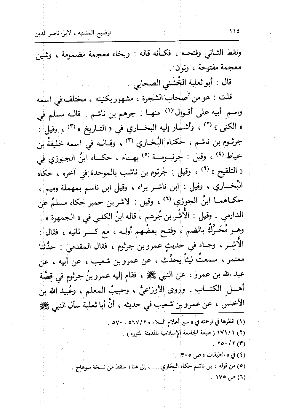 ونقط الثَّانِي وفتحه فَكَأَنَّهُ قَالَه: وبخاء مُعْجمَة مَضْمُومَة وشين مُعْجمَة مَفْتُوحَة وَنون. قَالَ: أَبُو ثَعْلَبَة الْخُشَنِي الصَّحَابِيّ. قلت: هُوَ من أَصْحَاب الشَّجَرَة مَشْهُور بكنيته مُخْتَلف فِي اسْمه وَاسم أَبِيه على أَقْوَال مِنْهَا: جرهم بن ناشم. قَالَه مُسلم فِي الكنى وَأَشَارَ إِلَيْهِ البُخَارِيّ فِي التَّارِيخ وَقيل: جرثوم بن ناشم حَكَاهُ البُخَارِيّ وَقَالَهُ فِي اسْمه خَليفَة بن خياط وَقيل: جرثومة بهاء حَكَاهُ ابْن الْجَوْزِيّ فِي التلقيح وَقيل: جرثوم بن ناشب بِالْمُوَحَّدَةِ فِي آخِره حَكَاهُ البُخَارِيّ وَقيل: ابْن ناشر برَاء وَقيل ابْن ناسم بِمُهْملَة وَمِيم حَكَاهُمَا ابْن الْجَوْزِيّ وَقيل: لاشر بن حمير حَكَاهُ مُسلم عَن الدَّارمِيّ. وَقيل: الأشر بن جرهم قَالَه ابْن الْكَلْبِيّ فِي الجمهرة. وَهُوَ محرك بِالضَّمِّ وَفتح بَعضهم أَوله مَعَ كسر ثَانِيه فَقَالَ: الأشر وَجَاء فِي حَدِيث عَمْرو بن جرثوم فَقَالَ الْمقدمِي: حَدثنَا مُعْتَمر سَمِعت ليثا يحدث عَن عَمْرو بن شُعَيْب عَن أَبِيه عَن عبد الله بن عَمْرو عَن النَّبِي صلى الله عَلَيْهِ وَسلم فَقَامَ إِلَيْهِ عَمْرو بن جرثوم فِي قصَّة أهل الْكتاب وروى الْأَوْزَاعِيّ وحبِيب الْمعلم وَعبيد الله بن الْأَخْنَس عَن عَمْرو بن شُعَيْب فِي حَدِيثه أَن أَبَا ثَعْلَبَة سَأَلَ النَّبِي صلى الله عَلَيْهِ وَسلم