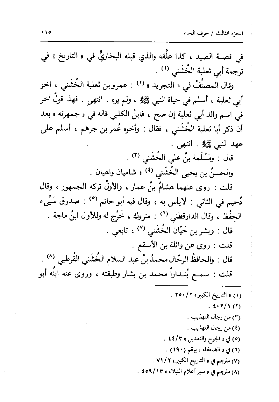 فِي قصَّة الصَّيْد كَذَا علقه وَالَّذِي قبله البُخَارِيّ فِي التَّارِيخ فِي تَرْجَمَة أبي ثَعْلَبَة الْخُشَنِي. وَقَالَ المُصَنّف فِي التَّجْرِيد: عَمْرو بن ثَعْلَبَة الْخُشَنِي أَخُو أبي ثَعْلَبَة أسلم فِي حَيَاة النَّبِي صلى الله عَلَيْهِ وَسلم وَلم يره. انْتهى. فَهَذَا قَول آخر فِي اسْم وَالِد أبي ثَعْلَبَة إِن صَحَّ فَابْن الْكَلْبِيّ قَالَه فِي جمهرته بعد أَن ذكر أَبَا ثَعْلَبَة الْخُشَنِي فَقَالَ: وَأَخُوهُ عمر بن جرهم أسلم على عهد النَّبِي صلى الله عَلَيْهِ وَسلم. انْتهى. قَالَ: ومسلمة بن عَليّ الْخُشَنِي. وَالْحسن بن يحيى الْخُشَنِي؛ شاميان واهيان. قلت: روى عَنْهُمَا هِشَام بن عمار وَالْأول تَركه الْجُمْهُور وَقَالَ دُحَيْم فِي الثَّانِي: لَا بَأْس بِهِ وَقَالَ فِيهِ أَبُو حَاتِم: صَدُوق سيئ الْحِفْظ وَقَالَ الدَّارَقُطْنِيّ: مَتْرُوك خرج لَهُ وللأول ابْن ماجة. قَالَ: وَبشر بن حَيَّان الْخُشَنِي تَابِعِيّ. قلت: روى عَن وَاثِلَة بن الْأَسْقَع. قَالَ: والحافظ الرّحال مُحَمَّد بن عبد السَّلَام الْخُشَنِي الْقُرْطُبِيّ. قلت: سمع بندارا مُحَمَّد بن بشار وطبقته وروى عَنهُ ابْنه أَبُو