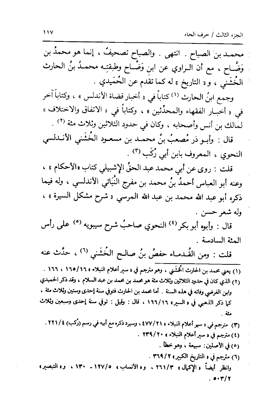 مُحَمَّد بن الصَّباح. انْتهى. والصباح تَصْحِيف إِنَّمَا هُوَ مُحَمَّد بن وضاح مَعَ أَن الرَّاوِي عَن ابْن وضاح وطبقته مُحَمَّد بن الْحَارِث الْخُشَنِي والتاريخ لَهُ كَمَا تقدم عَن الْحميدِي. وَجمع ابْن الْحَارِث كتابا فِي أَخْبَار قُضَاة الأندلس وكتابا آخر فِي أَخْبَار الْفُقَهَاء والمحدثين وكتابا فِي الِاتِّفَاق وَالِاخْتِلَاف لمَالِك بن أنس وَأَصْحَابه وَكَانَ فِي حُدُود الثَّلَاثِينَ وَثَلَاث مئة. قَالَ: وَأَبُو ذَر مُصعب بن مُحَمَّد بن مَسْعُود الْخُشَنِي الأندلسي النَّحْوِيّ الْمَعْرُوف بِابْن أبي ركب. قلت: روى عَن أبي مُحَمَّد عبد الْحق الإشبيلي كتاب الْأَحْكَام وَعنهُ أَبُو الْعَبَّاس أَحْمد بن مُحَمَّد بن مفرج النباتي الأندلسي وَله فِيمَا ذكره أَبُو عبد الله مُحَمَّد بن عبد الله المرسي شرح مُشكل السِّيرَة وَله شعر حسن. قَالَ: وَأَبوهُ أَبُو بكر النَّحْوِيّ صَاحب شرح سِيبَوَيْهٍ على رَأس المئة السَّادِسَة. قلت: وَمن القدماء حَفْص بن صَالح الْخُشَنِي حدث عَنهُ