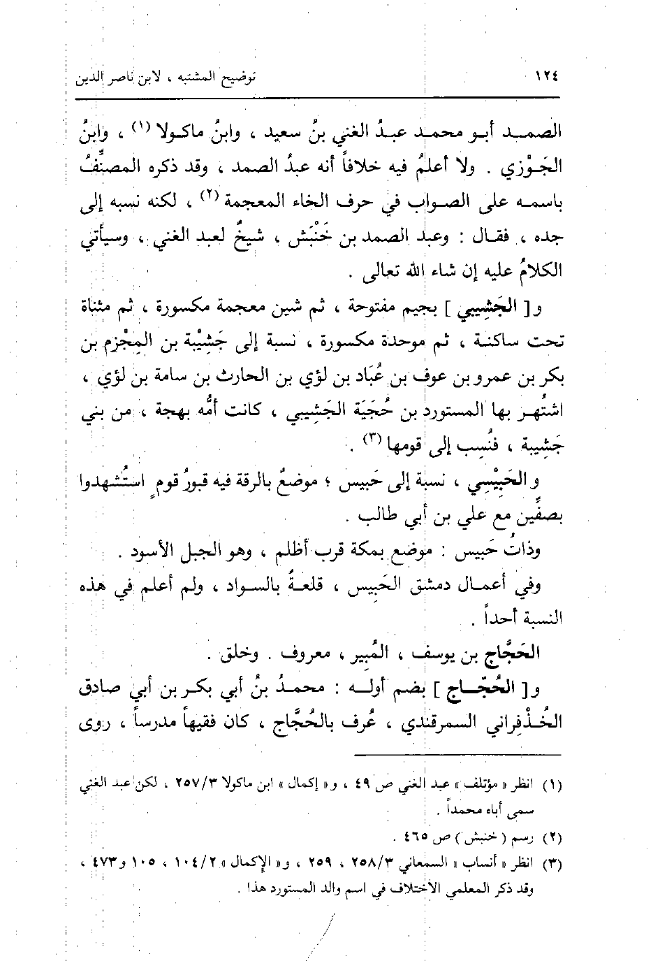 الصَّمد أَبُو مُحَمَّد عبد الْغَنِيّ بن سعيد وَابْن مَاكُولَا وَابْن الْجَوْزِيّ. وَلَا أعلم فِيهِ خلافًا أَنه عبد الصَّمد وَقد ذكره المُصَنّف باسمه على الصَّوَاب فِي حرف الْخَاء الْمُعْجَمَة لكنه نسبه إِلَى جده فَقَالَ: وَعبد الصَّمد بن خنبش شيخ لعبد الْغَنِيّ وَسَيَأْتِي الْكَلَام عَلَيْهِ إِن شَاءَ الله تَعَالَى. و [الجشيبي] بجيم مَفْتُوحَة ثمَّ شين مُعْجمَة مَكْسُورَة ثمَّ مثناة تَحت سَاكِنة ثمَّ مُوَحدَة مَكْسُورَة نِسْبَة إِلَى جشيبة بن المجزم بن بكر بن عَمْرو بن عَوْف بن عباد بن لؤَي بن الْحَارِث بن سامة بن لؤَي اشْتهر بهَا الْمُسْتَوْرد بن حجية الجشيبي كَانَت أمه بهجة من بني جشيبة فنسب إِلَى قَومهَا. والحبيسي نِسْبَة إِلَى حبيس؛ مَوضِع بالرقة فِيهِ قُبُور قوم اسْتشْهدُوا بصفين مَعَ عَليّ بن أبي طَالب. وَذَات حبيس: مَوضِع بِمَكَّة قرب أظلم وَهُوَ الْجَبَل الْأسود. وَفِي أَعمال دمشق الحبيس قلعة بِالسَّوَادِ وَلم أعلم فِي هَذِه النِّسْبَة أحدا. الْحجَّاج بن يُوسُف المبير مَعْرُوف. وَخلق. و [الْحجَّاج] بِضَم أَوله: مُحَمَّد بن أبي بكر بن أبي صَادِق الخذفراني السَّمرقَنْدِي عرف بالحجاج كَانَ فَقِيها مدرسا روى