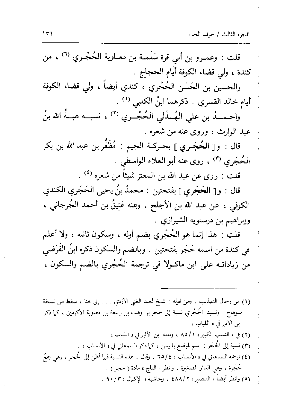 قلت: وَعَمْرو بن أبي قُرَّة سَلمَة بن مُعَاوِيَة الحجري من كِنْدَة ولي قَضَاء الْكُوفَة أَيَّام الْحجَّاج. وَالْحُسَيْن بن الْحسن الحجري كندي أَيْضا ولي قَضَاء الْكُوفَة أَيَّام خَالِد الْقَسرِي. ذكرهمَا ابْن الْكَلْبِيّ. وَأحمد بن عَليّ الْهُذلِيّ الحجري نسبه هبة الله بن عبد الْوَارِث وروى عَنهُ من شعره. قَالَ: و [الحجري] بحركة الْجِيم: مظفر بن عبد الله بن بكر الحجري روى عَنهُ أَبُو الْعَلَاء الوَاسِطِيّ. قلت: روى عَن عبد الله بن المعتز شَيْئا من شعره. قَالَ: و [الحجري] بِفتْحَتَيْنِ: مُحَمَّد بن يحيى الحجري الْكِنْدِيّ الْكُوفِي عَن عبد الله بن الْأَجْلَح وَعنهُ عَتيق بن أَحْمد الْجِرْجَانِيّ وَإِبْرَاهِيم بن درسْتوَيْه الشِّيرَازِيّ. قلت: هَذَا إِنَّمَا هُوَ الحجري بِضَم أَوله وَسُكُون ثَانِيه وَلَا أعلم فِي كِنْدَة من اسْمه حجر بِفتْحَتَيْنِ. وبالضم والسكون ذكره ابْن الفرضي من زياداته على ابْن مَاكُولَا فِي تَرْجَمَة الحجري بِالضَّمِّ والسكون