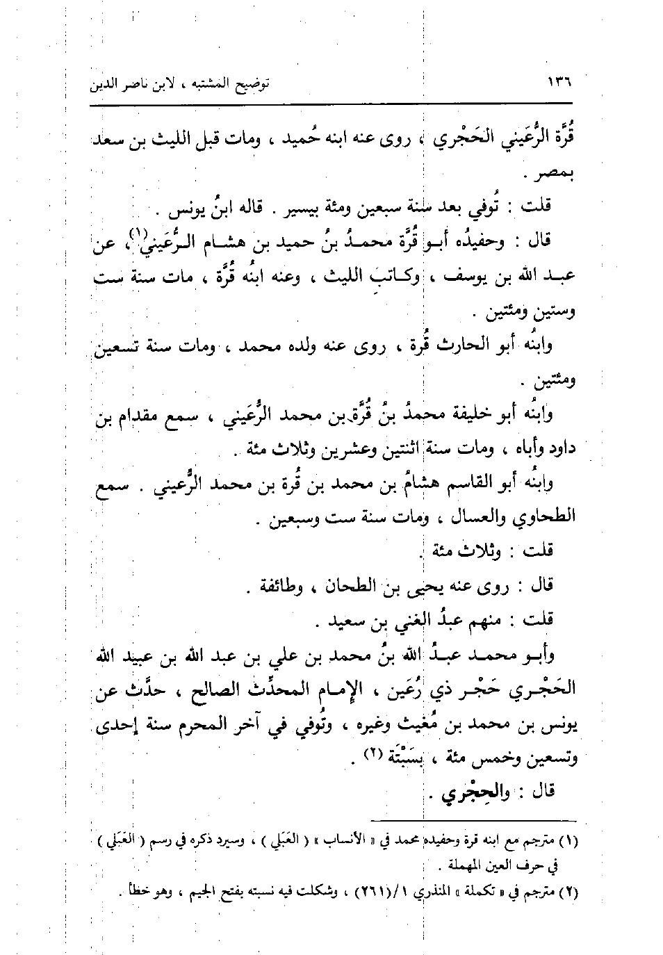 قُرَّة الرعيني الحجري روى عَنهُ ابْنه حميد وَمَات قبل اللَّيْث بن سعد بِمصْر. قلت: توفّي بعد سنة سبعين ومئة بِيَسِير. قَالَه ابْن يُونُس. قَالَ: وحفيده أَبُو قُرَّة مُحَمَّد بن حميد بن هِشَام الرعيني عَن عبد الله بن يُوسُف وَكَاتب اللَّيْث وَعنهُ ابْنه قُرَّة مَاتَ سنة سِتّ وَسِتِّينَ ومئتين. وَابْنه أَبُو الْحَارِث قُرَّة روى عَنهُ وَلَده مُحَمَّد وَمَات سنة تسعين ومئتين. وَابْنه أَبُو خَليفَة مُحَمَّد بن قُرَّة بن مُحَمَّد الرعيني سمع مِقْدَام بن دَاوُد وأباه وَمَات سنة اثْنَتَيْنِ وَعشْرين وَثَلَاث مئة. وَابْنه أَبُو الْقَاسِم هِشَام بن مُحَمَّد بن قُرَّة بن مُحَمَّد الرعيني. سمع الطَّحَاوِيّ والعسال وَمَات سنة سِتّ وَسبعين. قلت: وَثَلَاث مئة. قَالَ: روى عَنهُ يحيى بن الطَّحَّان وَطَائِفَة. قلت: مِنْهُم عبد الْغَنِيّ بن سعيد. وَأَبُو مُحَمَّد عبد الله بن مُحَمَّد بن عَليّ بن عبد الله بن عبيد الله الحجري حجر ذِي رعين الإِمَام الْمُحدث الصَّالح حدث عَن يُونُس بن مُحَمَّد بن مغيث وَغَيره وَتُوفِّي فِي آخر الْمحرم سنة إِحْدَى وَتِسْعين وَخمْس مئة بسبتة. قَالَ: والحجري.