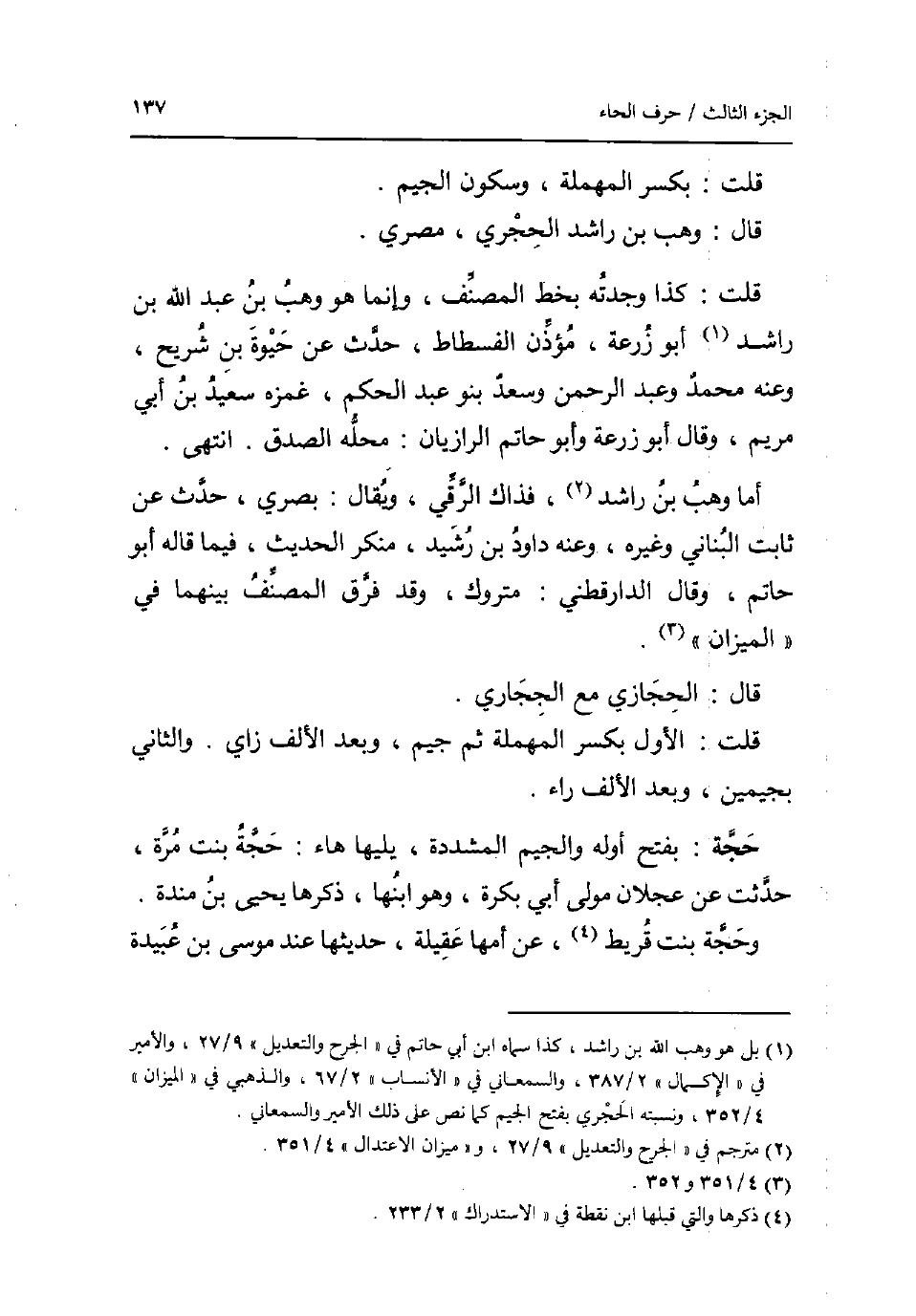 قلت: بِكَسْر الْمُهْملَة وَسُكُون الْجِيم. قَالَ: وهب بن رَاشد الحجري مصري. قلت: كَذَا وجدته بِخَط المُصَنّف وَإِنَّمَا هُوَ وهب بن عبد الله بن رَاشد أَبُو زرْعَة مُؤذن الْفسْطَاط حدث عَن حَيْوَة بن شُرَيْح وَعنهُ مُحَمَّد وَعبد الرَّحْمَن وَسعد بَنو عبد الحكم غمزه سعيد بن أبي مَرْيَم وَقَالَ أَبُو زرْعَة وَأَبُو حَاتِم الرازيان: مَحَله الصدْق. انْتهى. أما وهب بن رَاشد فَذَاك الرقي وَيُقَال: بَصرِي حدث عَن ثَابت الْبنانِيّ وَغَيره وَعنهُ دَاوُد بن رشيد مُنكر الحَدِيث فِيمَا قَالَه أَبُو حَاتِم وَقَالَ الدَّارَقُطْنِيّ: مَتْرُوك وَقد فرق المُصَنّف بَينهمَا فِي الْمِيزَان. قَالَ: الْحِجَازِي مَعَ الججاري. قلت: الأول بِكَسْر الْمُهْملَة ثمَّ جِيم وَبعد الْألف زَاي. وَالثَّانِي بجيمين وَبعد الْألف رَاء. حجَّة: بِفَتْح أَوله وَالْجِيم الْمُشَدّدَة يَليهَا هَاء: حجَّة بنت مرّة حدثت عَن عجلَان مولى أبي بكرَة وَهُوَ ابْنهَا ذكرهَا يحيى بن مندة. وَحجَّة بنت قريط عَن أمهَا عقيلة حَدِيثهَا عِنْد مُوسَى بن عُبَيْدَة