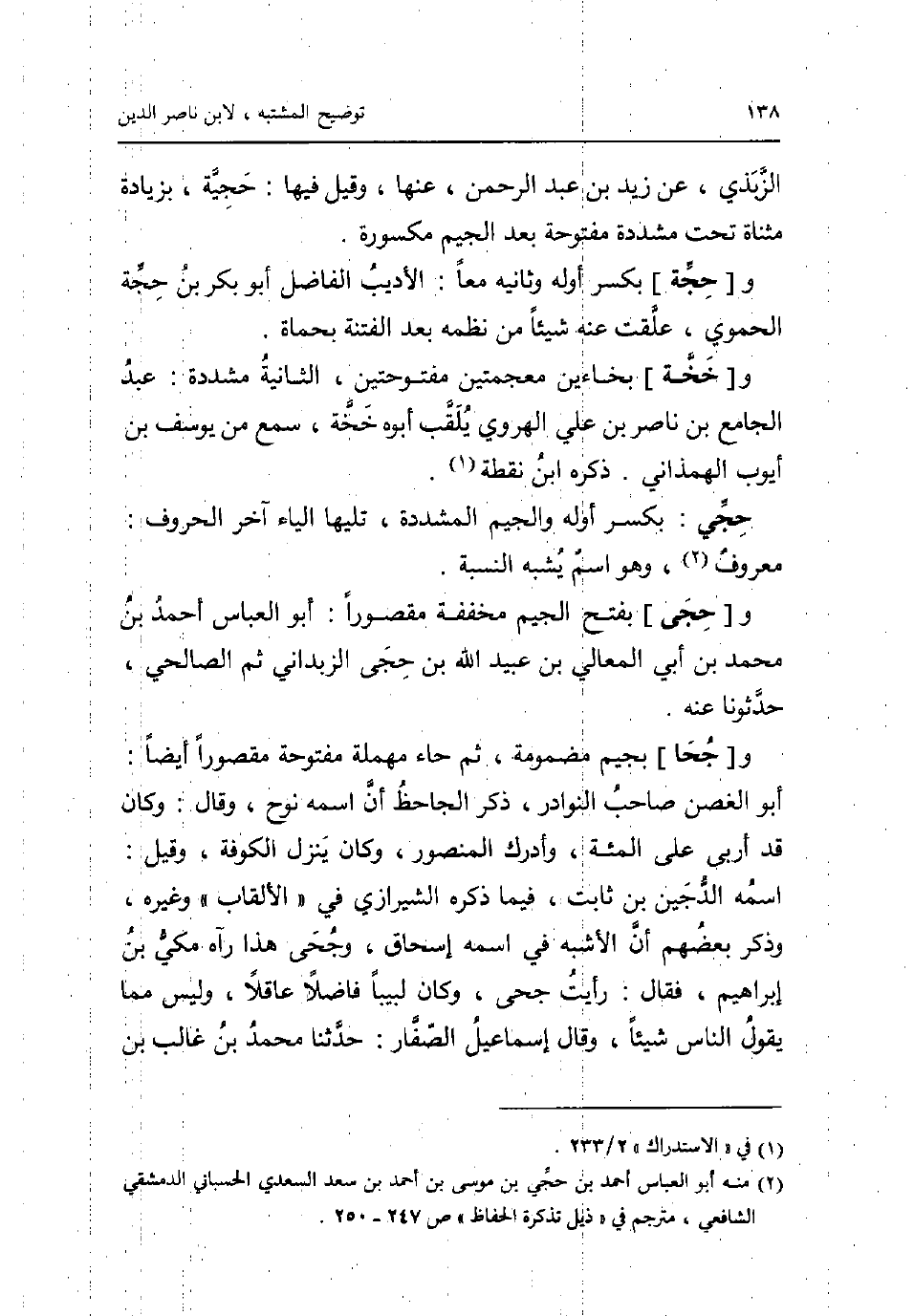 الزبذي عَن زيد بن عبد الرَّحْمَن عَنْهَا وَقيل فِيهَا: حجية بِزِيَادَة مثناة تَحت مُشَدّدَة مَفْتُوحَة بعد الْجِيم مَكْسُورَة. و [حجَّة] بِكَسْر أَوله وثانيه مَعًا: الأديب الْفَاضِل أَبُو بكر بن حجَّة الْحَمَوِيّ علقت عَنهُ شَيْئا من نظمه بعد الْفِتْنَة بحماة. و [خخة] بخاءين معجمتين مفتوحتين الثَّانِيَة مُشَدّدَة: عبد الْجَامِع بن نَاصِر بن عَليّ الْهَرَوِيّ يلقب أَبوهُ خخة سمع من يُوسُف بن أَيُّوب الهمذاني. ذكره ابْن نقطة. حجي: بِكَسْر أَوله وَالْجِيم الْمُشَدّدَة تَلِيهَا الْيَاء آخر الْحُرُوف: مَعْرُوف وَهُوَ اسْم يشبه النِّسْبَة. و [حجى] بِفَتْح الْجِيم مُخَفّفَة مَقْصُورا: أَبُو الْعَبَّاس أَحْمد بن مُحَمَّد بن أبي الْمَعَالِي بن عبيد الله بن حجى الزبداني ثمَّ الصَّالِحِي حدثونا عَنهُ. و [جحا] بجيم مَضْمُومَة ثمَّ حاء مُهْملَة مَفْتُوحَة مَقْصُورا أَيْضا: أَبُو الْغُصْن صَاحب النَّوَادِر ذكر الجاحظ أَن اسْمه نوح وَقَالَ: وَكَانَ قد أربى على المئة وَأدْركَ الْمَنْصُور وَكَانَ ينزل الْكُوفَة وَقيل: اسْمه الدجين بن ثَابت فِيمَا ذكره الشِّيرَازِيّ فِي الألقاب وَغَيره وَذكر بَعضهم أَن الْأَشْبَه فِي اسْمه إِسْحَاق وجحى هَذَا رَآهُ مكي بن إِبْرَاهِيم فَقَالَ: رَأَيْت جحى وَكَانَ لبيبا فَاضلا عَاقِلا وَلَيْسَ مِمَّا يَقُول النَّاس شَيْئا وَقَالَ إِسْمَاعِيل الصفار: حَدثنَا مُحَمَّد بن غَالب بن