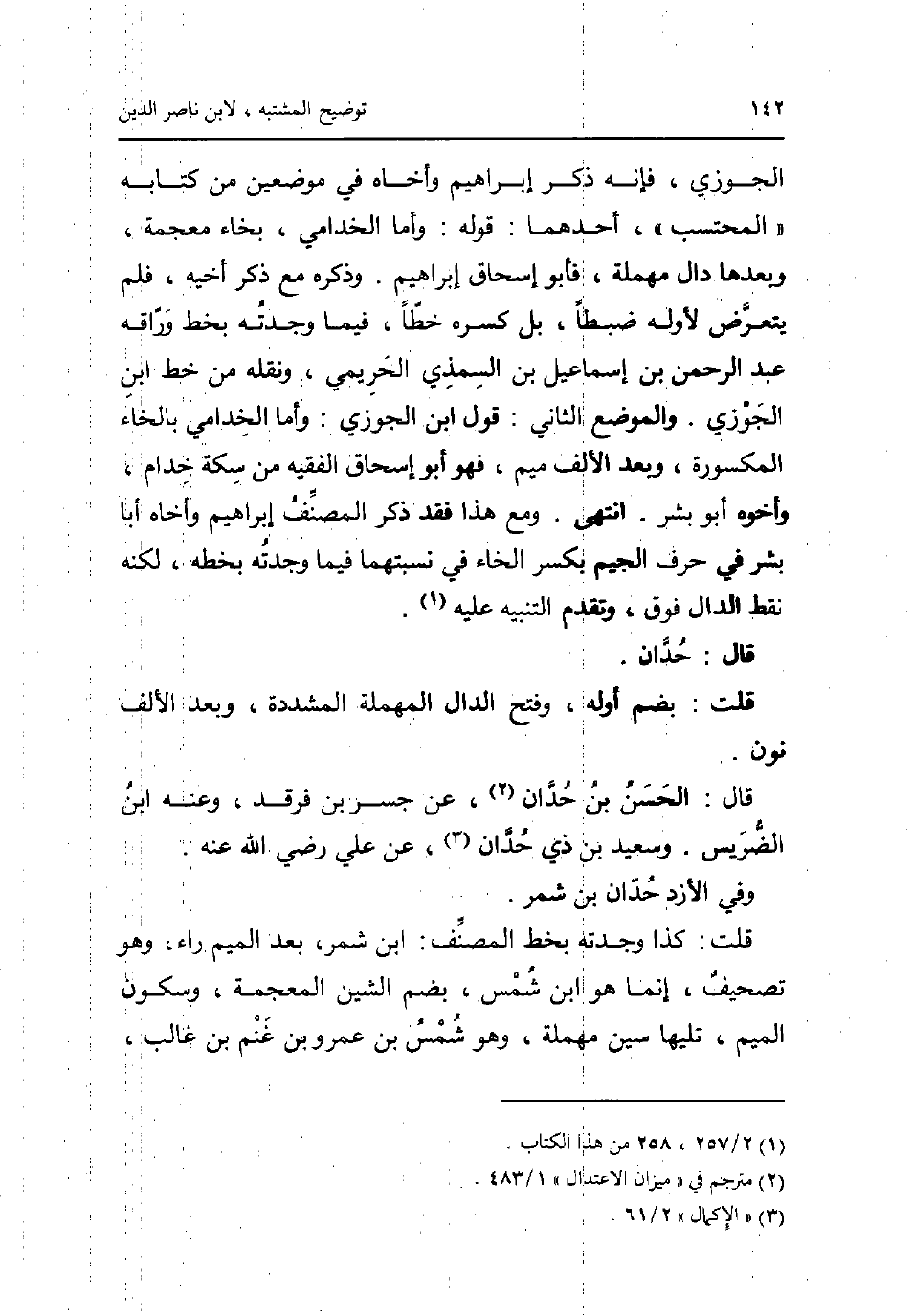 الْجَوْزِيّ فَإِنَّهُ ذكر إِبْرَاهِيم وأخاه فِي موضِعين من كِتَابه الْمُحْتَسب أَحدهمَا: قَوْله: وَأما الخدامي بخاء مُعْجمَة وَبعدهَا دَال مُهْملَة فَأَبُو إِسْحَاق إِبْرَاهِيم. وَذكره مَعَ ذكر أَخِيه فَلم يتَعَرَّض لأوله ضبطا بل كَسره خطا فِيمَا وجدته بِخَط وراقه عبد الرَّحْمَن بن إِسْمَاعِيل بن السمذي الحريمي وَنَقله من خطّ ابْن الْجَوْزِيّ. والموضع الثَّانِي: قَول ابْن الْجَوْزِيّ: وَأما الخدامي بِالْخَاءِ الْمَكْسُورَة وَبعد الْألف مِيم فَهُوَ أَبُو إِسْحَاق الْفَقِيه من سكَّة خدام وَأَخُوهُ أَبُو بشر. انْتهى. وَمَعَ هَذَا فقد ذكر المُصَنّف إِبْرَاهِيم وأخاه أَبَا بشر فِي حرف الْجِيم بِكَسْر الْخَاء فِي نسبتهما فِيمَا وجدته بِخَطِّهِ لكنه نقط الدَّال فَوق وَتقدم التَّنْبِيه عَلَيْهِ. قَالَ: حدان. قلت: بِضَم أَوله وَفتح الدَّال الْمُهْملَة الْمُشَدّدَة وَبعد الْألف نون. قَالَ: الْحسن بن حدان عَن جسر بن فرقد وَعنهُ ابْن الضريس. وَسَعِيد بن ذِي حدان عَن عَليّ رَضِي الله عَنهُ. وَفِي الأزد حدان بن شمر. قلت: كَذَا وجدته بِخَط المُصَنّف: ابْن شمر بعد الْمِيم رَاء وَهُوَ تَصْحِيف إِنَّمَا هُوَ ابْن شمس بِضَم الشين الْمُعْجَمَة وَسُكُون الْمِيم تَلِيهَا سين مُهْملَة وَهُوَ شمس بن عَمْرو بن غنم بن غَالب